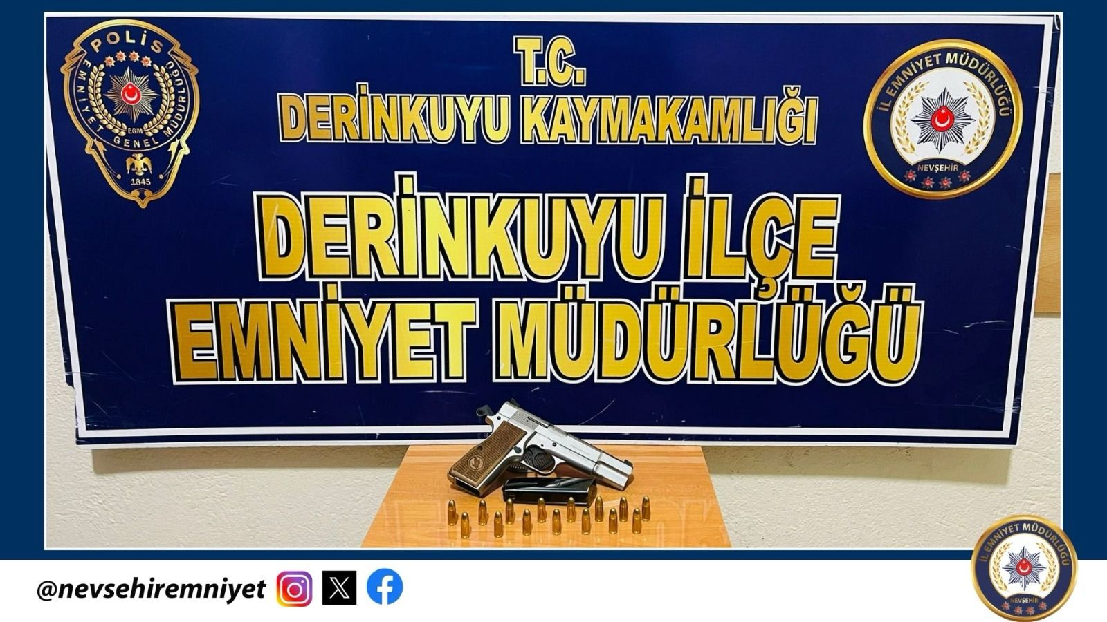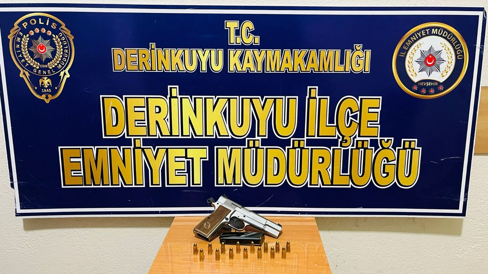 Derinkuyu İlçe Emniyet Müdürlüğü ekiplerinin yapmış oldukları uygulama esnasında çok sayıda fişek ele geçirildi. Kontrol edilen bir şahsın üzerinde beline takılı vaziyette 1 adet tabanca, bu tabancaya ait 1 adet şarjör ve15 adet fişek yakalanırken şahıs hakkında gerekli adli ve idari işlemlere başlandı.