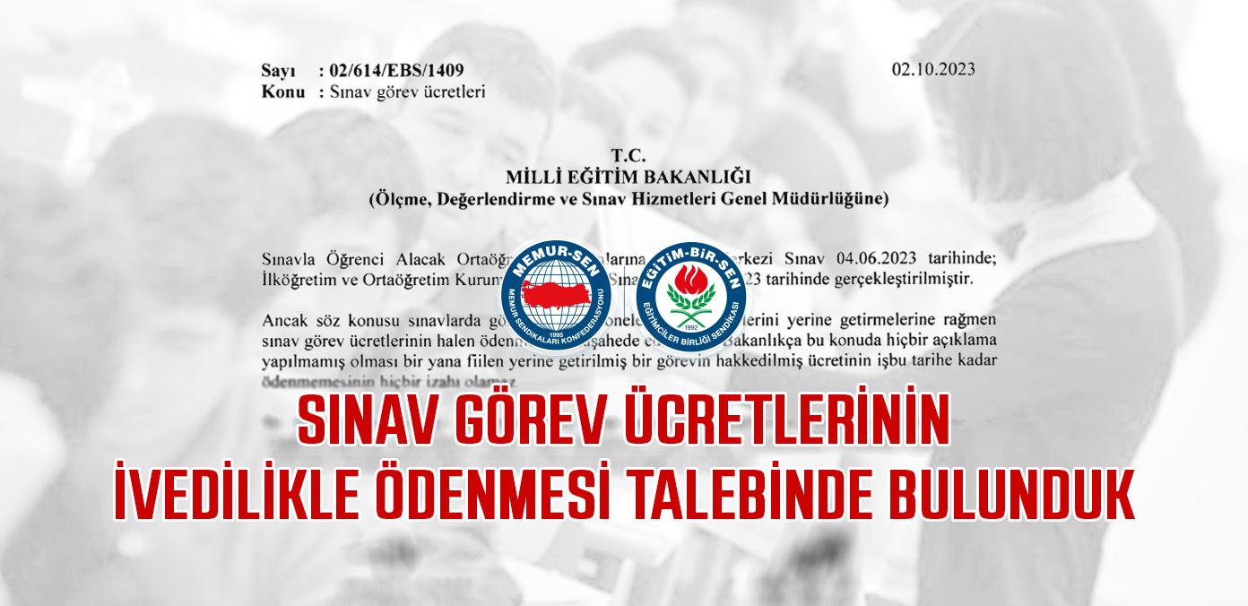 Eğitim-Bir-Sen Millî Eğitim Bakanlığı’na başvurarak, bakanlık tarafından gerçekleştirilen LGS ve bursluluk sınavlarında görev alan eğitim çalışanlarının sınav görev ücretlerinin ödenmesini istedi.
