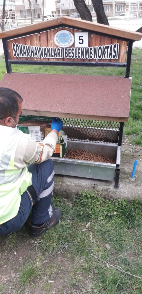 Veteriner İşleri Müdürlüğü ve Temizlik İşleri Müdürlüğü ekipleri mahallelerdeki parkların yanı sıra yeşil alanlarda kuşlar, kediler ve köpekler için oluşturulan beslenme ünitelerine düzenli aralıklarla mama, yem ve su bırakıyor.