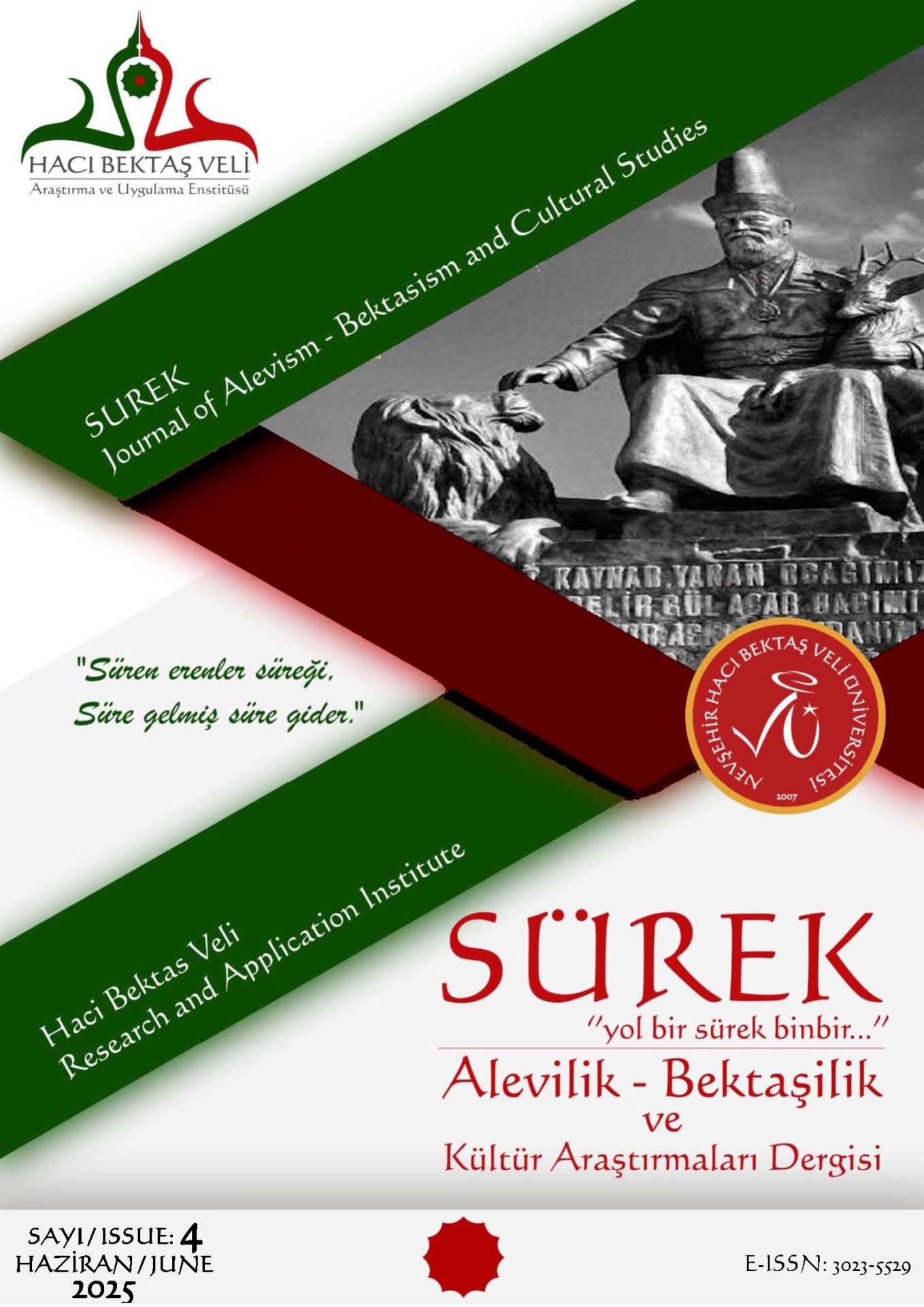 Nevşehir Hacı Bektaş Veli Üniversitesi (NEVÜ) Hacı Bektaş Veli Araştırma ve Uygulama Enstitüsü’nün bilimsel dergisi olan ‘SÜREK Alevilik – Bektaşilik ve Kültür Araştırmaları Dergisi’nin dördüncü sayısı yayınlanarak NEVÜ’nün süreli akademik yayınları arasında yerini aldı.