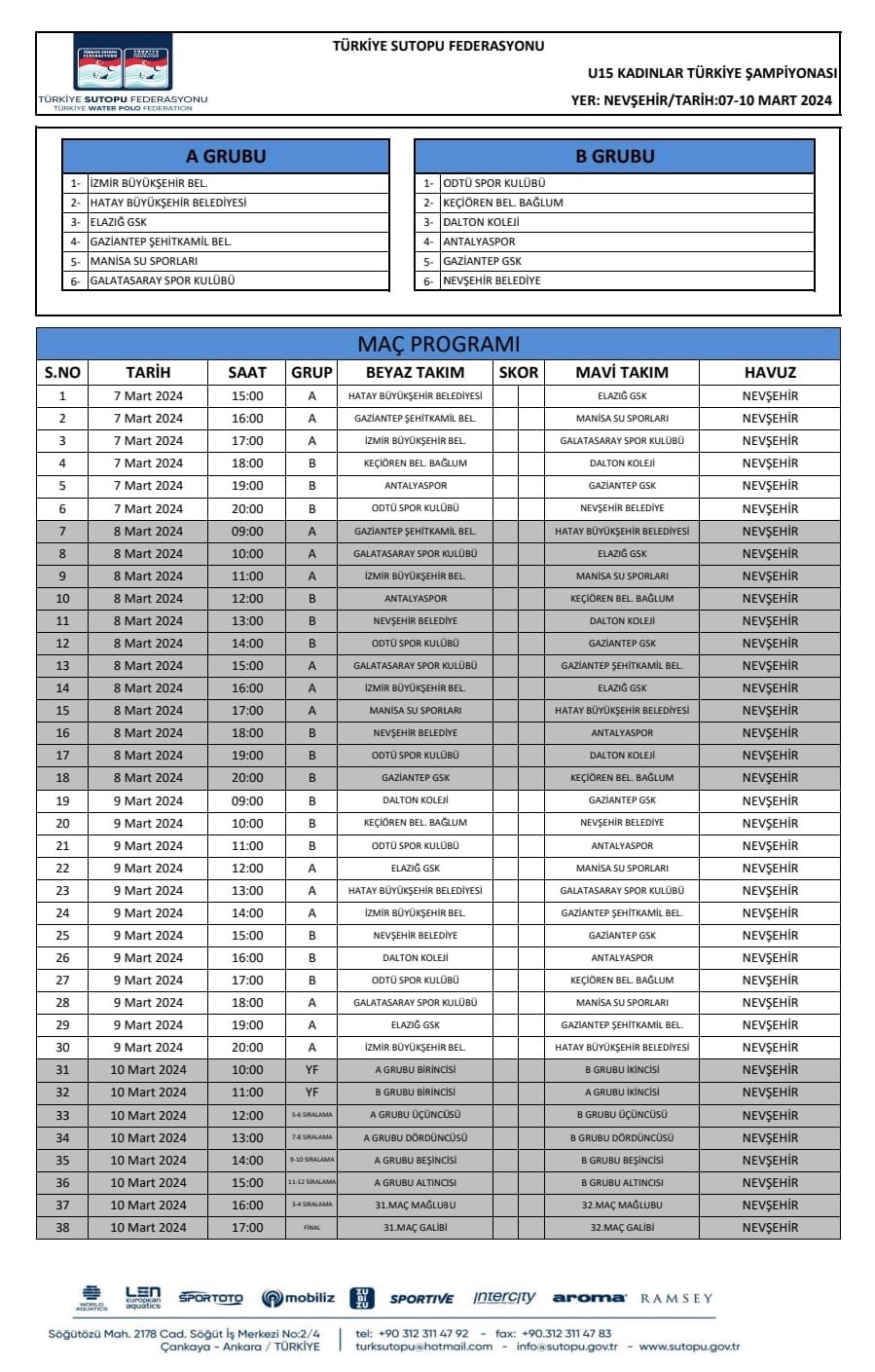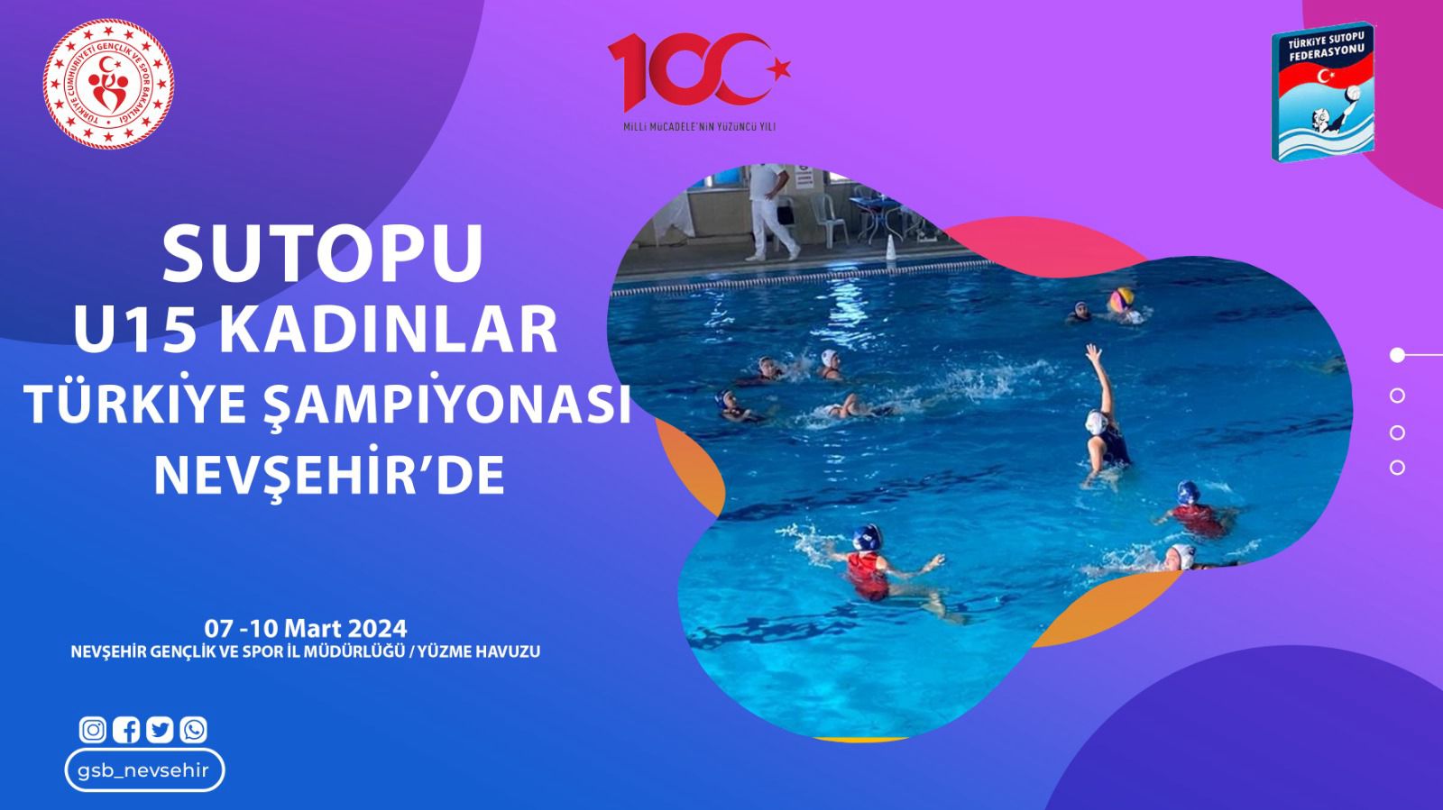07 – 10 Mart 2024 tarihleri arasında Sutopu U-15 Kadınlar Türkiye Şampiyonası ilimiz ev sahipliğinde Nevşehir Spor Kompleksi Yüzme Havuzunda düzenlenecek. İlimiz ev sahipliğinde düzenlenecek olan U-15 Kadınlar Türkiye Şampiyonası’na ODTÜ, Keçiören Belediyesi Bağlum Sk., Antalyaspor, İzmir Büyükşehir Belediye Sk., Dalton Koleji, Manisa Su Sporları Sk., Galatasaray, Hatay Büyükşehir Belediye Sk., Elazığ GSK., Gaziantep Şehitkamil Belediye Sk., Gaziantep GSK. ve Nevşehir Bel. GSK. takımları katılacak. Toplamda 12 takım ve yaklaşık 300 sporcu, antrenör ve hakemlerin katılacağı müsabakalar 07 Mart Perşembe günü saat 15.00’da başlayacak.