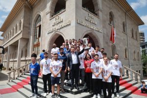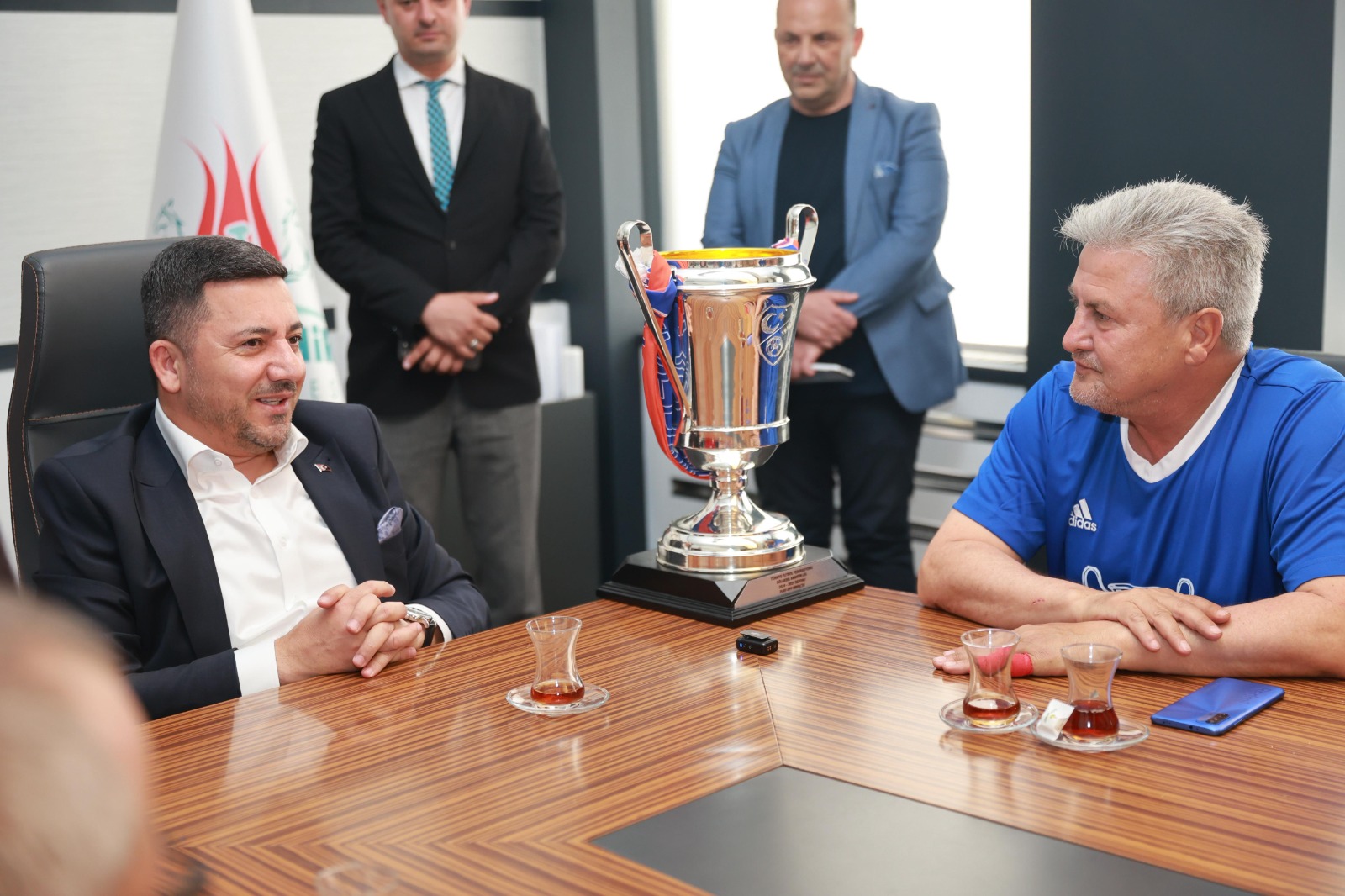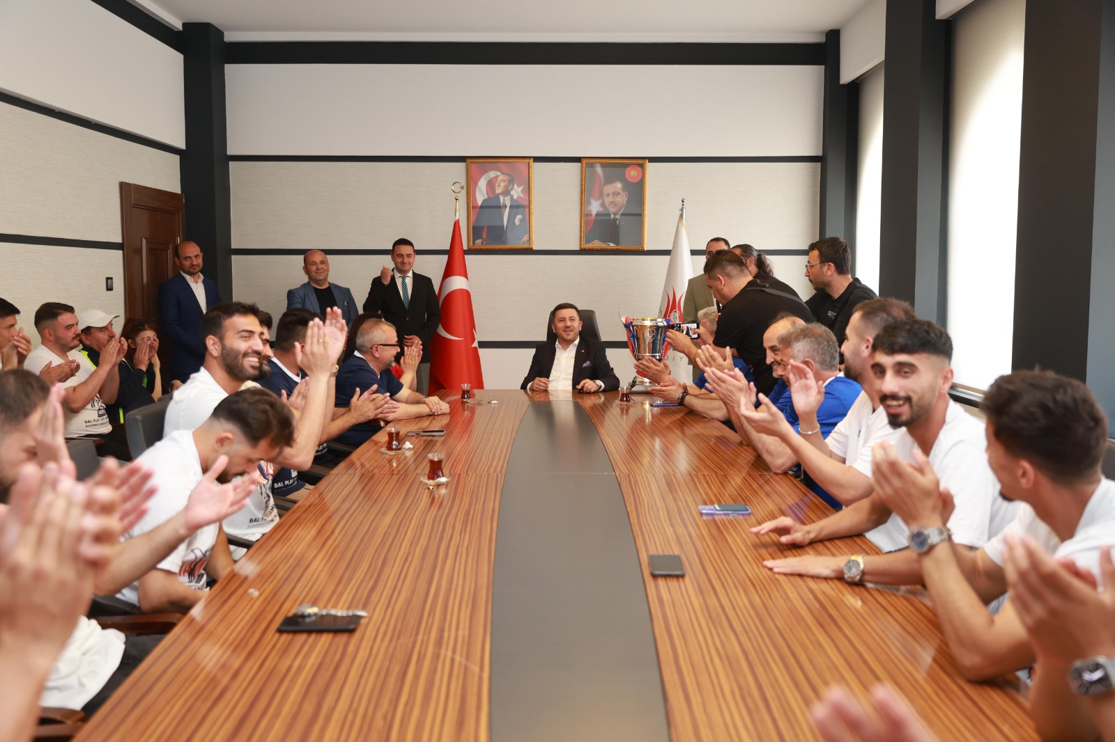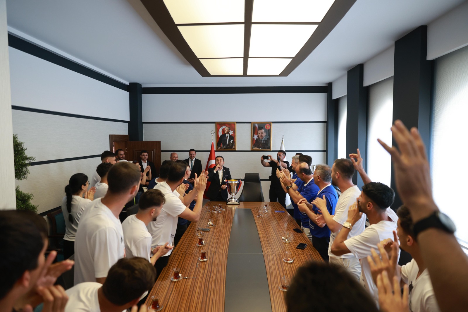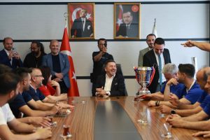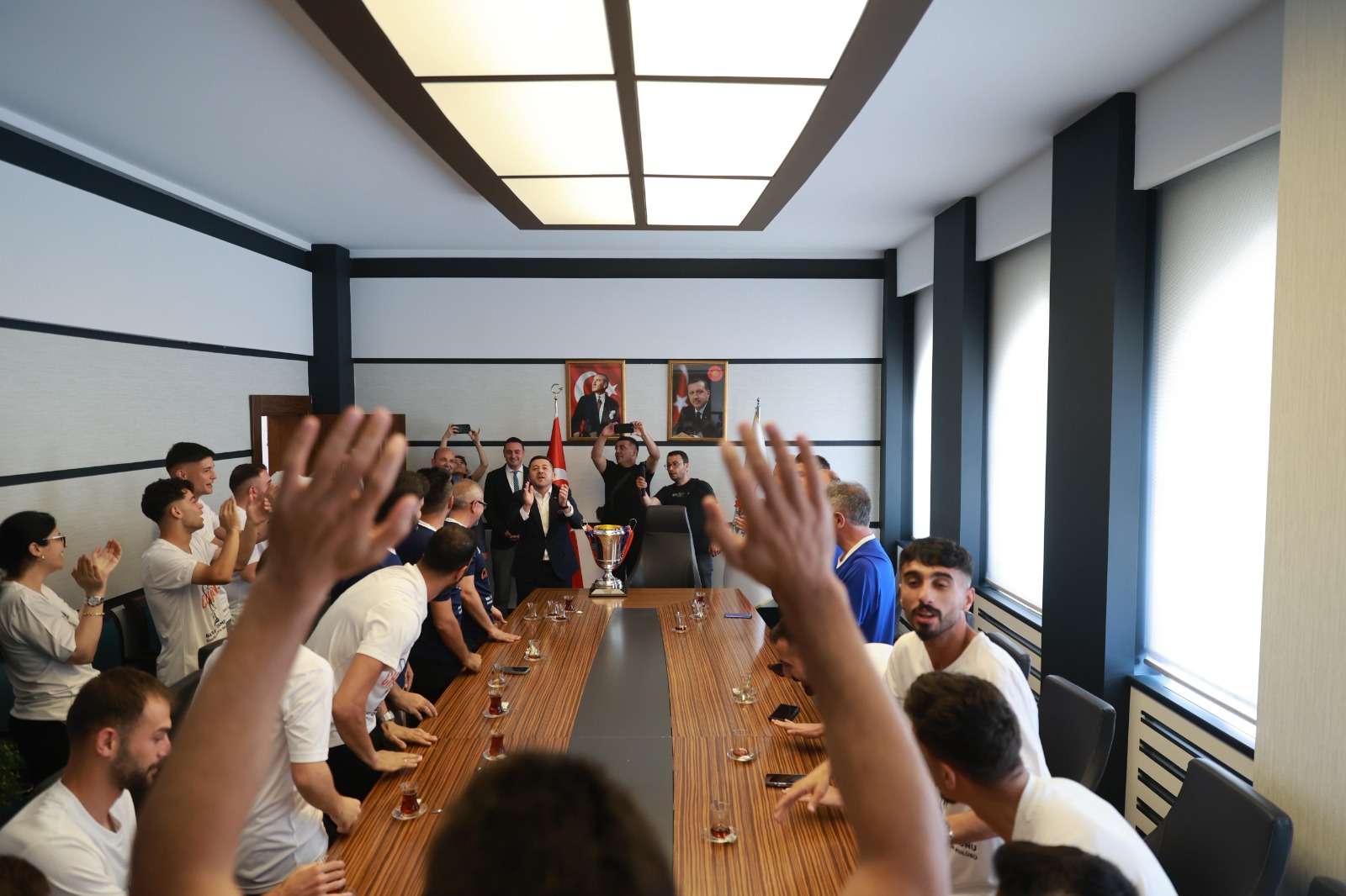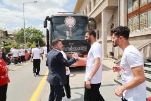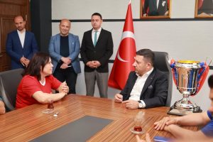 2024-2025 Futbol Sezonu Bölgesel Amatör Lig Play-Off şampiyonu olarak 3. Lige yükselen Suvermez Kapadokyaspor Kulübü Başkanı Emine Türkmen Demir, teknik heyet ve futbolcular, Nevşehir Belediye Başkanı Rasim Arı’yı ziyaret etti.