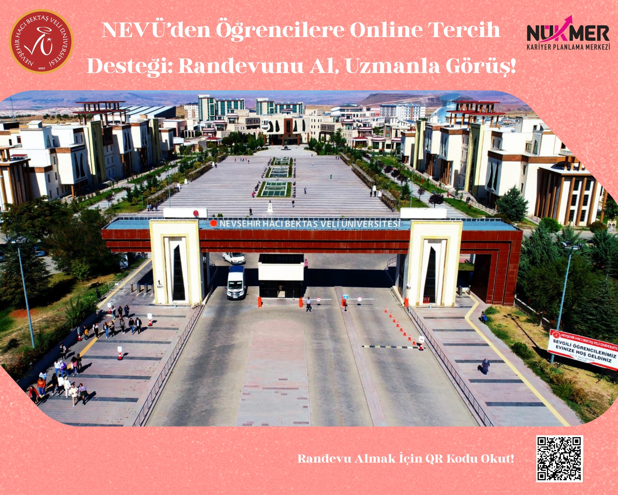 NEVÜ, yüz yüze etkinliklerin yanı sıra adaylara çevrim içi tercih danışmanlığı desteği de sunuyor. NÜKMER tarafından hayata geçirilen “Randevunu Al, Uzmanla Görüş” temalı sistem sayesinde, aday öğrenciler NEVÜ tanıtım afişlerinde yer alan QR kodu cep telefonlarıyla okutarak online randevu oluşturabiliyor. Belirlenen tarih ve saatte gerçekleştirilen online görüşmelerde, alanında uzman tercih danışmanları adaylara birebir rehberlik sağlıyor.