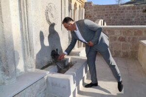 Nevşehir Belediye Başkanı Dr. Mehmet Savran, musluklarından uzun yıllar sonra yeniden su akan tarihi çeşmede incelemelerde bulundu.