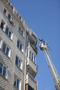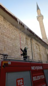 Nevşehir Belediyesi İtfaiye Müdürlüğü ekipleri, yoğun kar yağışı ve soğuk hava sonucu yüksek katlı binaların çatılarında oluşan ve can güvenliğini tehdit eden buz sarkıtlarının temizlenmesi için çalışma başlattı.