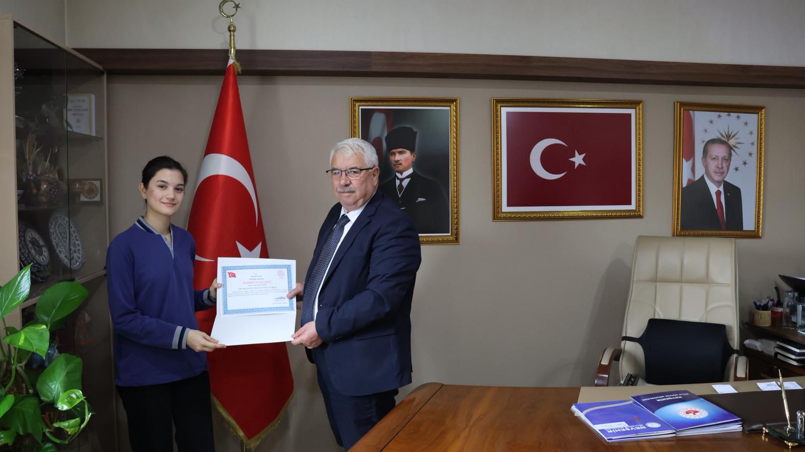 TEKNOFEST 2025’te, yüksek teknik donanım ve keskin bir zekâ gerektiren “Pardus Hata Yakalama ve Öneri Yarışması” kategorisinde finale kalarak Nevşehir’i gururlandıran Nevşehir Şehit Demet Sezen Kız Anadolu İmam Hatip Lisesi öğrencisi Zehra Betül Yüksel ve okul müdürü Mustafa Kılınç, İl Millî Eğitim Müdürü Yusuf Yazıcı’yı ziyaret ettiler.