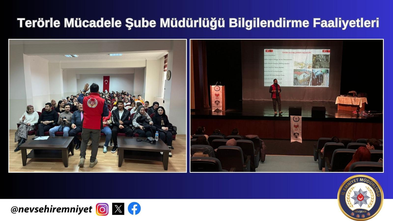 Terörle Mücadele Şube Müdürlüğü Bilgilendirme Faaliyetleri devam ediyor. Nevşehir İl Emniyet Müdürlüğü Terörle Mücadele Şube Müdürlüğü Bilgilendirme ve Önleme Faaliyetleri Büro Amirliği görevlileri tarafından ilçelerde bulunan Meslek Yüksek Okullarındaki akademisyen, idareci ve öğrencilerden oluşan 605 katılımcıya yönelik terörün tanımı, örgütlerin eleman temin etme yöntemleri, radikalleşme konularında bilgilendirme yapıldı.