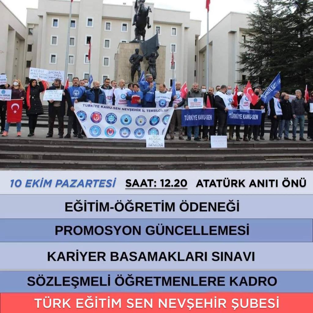 Türk Eğitim-Sen Nevşehir Şubesi 10 Ekim Pazartesi günü saat 12.20’de başta Nevşehir Valiliği Atatürk anıtı olmak üzere tüm ilçelerimizde aynı saatte ilçe Milli Eğitim Müdürlükleri önünde Eğitim-Öğretim ödeneği, Promosyon güncellenmesi, sözde Kariyer Basamakları Sınavı, Sözleşmeli Öğretmenlere kadro , Milli Eğitim çalışanlarının sorunları , Üniversite’de çalışan akademik ve idari personelin sorunlarını içeren kitlesel basın açıklaması yapacaktır.