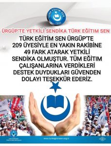Türk Eğitim Sen Ürgüp’ye 209 üyesiyle en yakın rakibine 49 fark atarak Yetkili sendika olmuştur.