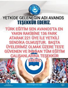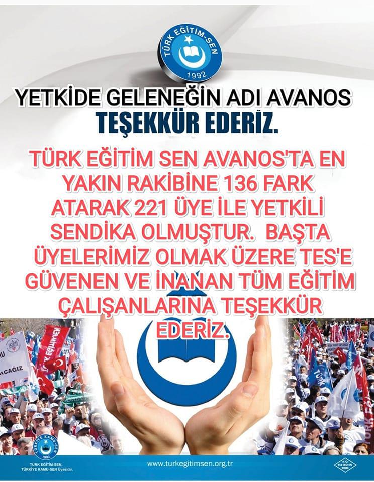 Türk Eğitim Sen Avanos İlçe Başkanı Taner Durukan yaptığı açıklamada; “Türk Eğitim Sen’in sendikal duruşuna ve mücadelesine inanarak destek veren başta ilçe yönetim kurulumuza, kurum temsilcilerimize, üyelerimize ve eğitim çalışanlarına teşekkür ederim. Türk Eğitim Sen ne iktidarların saha sorumluluğunu, ne marjinal ideolojilerin temsilciliğini ne de terör örgütlerinin uzantısıdır. Terör örgütleri ile halay çekenlerle basın açıklaması yapanlarla bizim işimiz olmaz. Biz Türkiye sevdalısı, Atatürk ve Cumhuriyet aşığı bir sendikanın mensubuyuz. Bugün çalışanların sosyo ekonomik yaşam seviyelerini yükseltmek için mücadele veriyoruz aynı zamanda haksızlık karşısında elif gibi dimdik mücadelemizi yapıyoruz. İnanıyoruz ki sorunları çözülmüş özlük hakları iyileştirilmiş ekonomik olarak refahlamış eğitim çalışanları ile müreffeh ve büyük Türkiye’yi hep birlikte inşa edebiliriz. İnanıyoruz başaracağız. Bizler ekmek kavgasının önüne Türkiye sevdasını koymuş bir teşkilatın mensubu fikriyatın temsilcileriyiz.” Dedi.