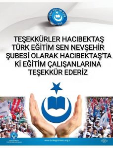 TES. Şube başkanı Tayfur Urgenç; “Türk Eğitim Sen siyasal konjektürel gelişmelere göre pozisyon alan bir sendika değildir. Türk Eğitim Sen’in temel ilke ve değerleri Türkiye Cumhuriyeti’nin kuruluşundaki ruhta gizlidir. Kuvayı Milliye’de gizlidir. Türk Eğitim Sen Milli mücadele yıllarındaki milli dernekler gibi vatanperverlik duyguları ön planda olan bir STK’dır. Türk Eğitim Sen gücünü üyelerden alır. Üyelere kullanır. Hacıbektaş’ın kıymetli eğitim çalışanlarına teşekkür ediyorum.” Dedi.
