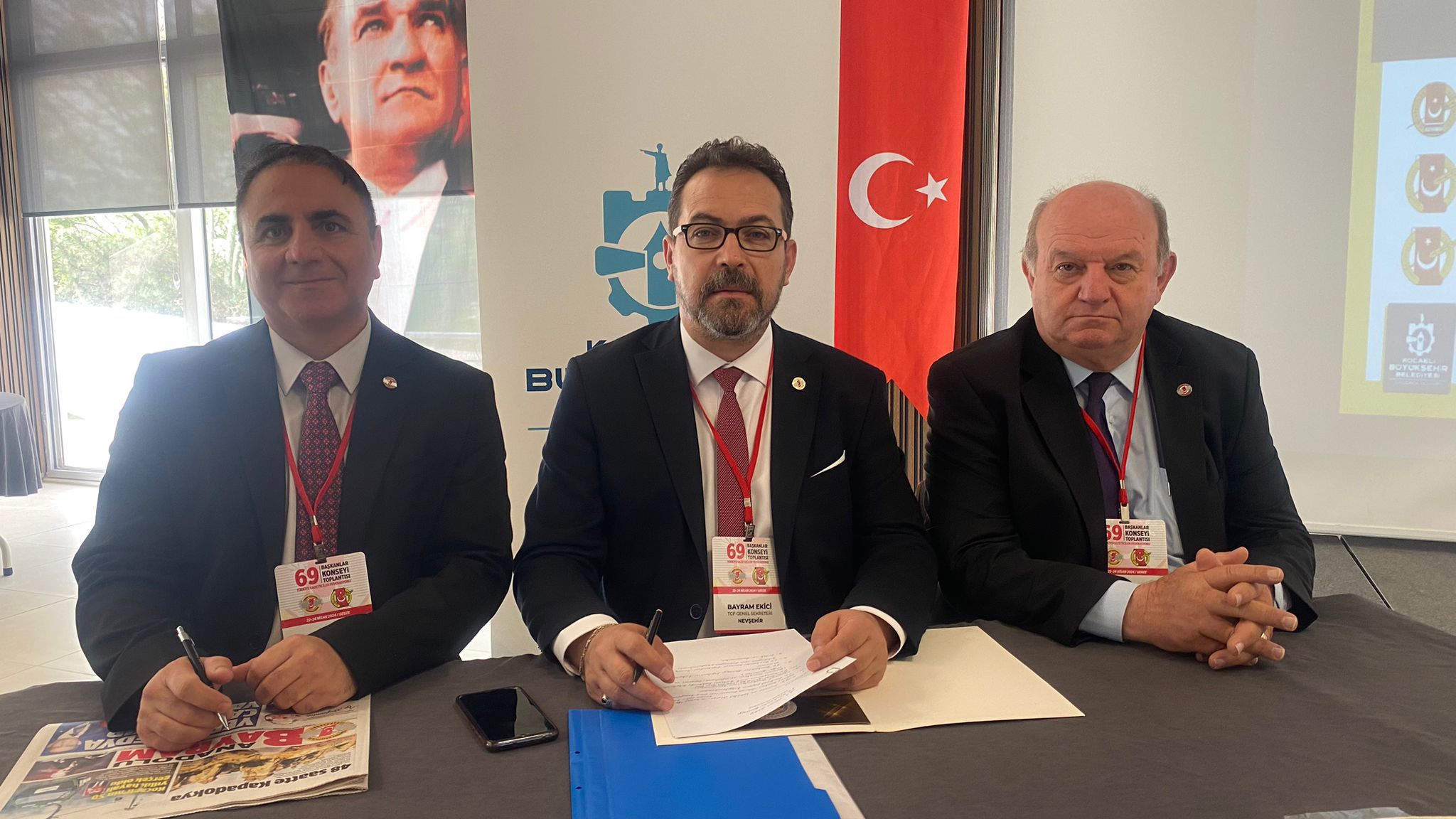 Kocaeli Büyükşehir Belediyesi Darıca Bayramoğlu Balyanoz Eğitim Tesisleri’nde düzenlenen TGF 69. Başkanlar konseyi toplantısına Türkiye Gazeteciler Federasyonu Başkanı Yılmaz Karaca, TGF Başkan Yardımcısı ve Gebze Gazeteciler Cemiyeti Başkanı Levent Altun ile 81 ilden gazeteciler katıldı. Türkiye Gazeteciler Federasyonu 69. Başkanlar konseyi toplantısının Divan Başkanlığını Bayram Ekici, başkan yardımcılıklarını ise Cafer Esendemir ve Levent Altun yaptı. Türkiye Gazeteciler Federasyonu 69. Başkanlar Konseyi toplantısının açılış konuşmasını yapan TGF Başkan Yardımcısı ve Gebze Gazeteciler Cemiyeti Başkanı Levent Altun: “ Türkiye’nin dört bir yanından Gebzemize gelen gazeteci meslektaşlarımızı saygıyla selamlıyorum. Türkiye Büyük Millet Meclisi’nin 104. kuruluş yıl dönümünü kutluyorum. Gebze sanayinin, ticaretin, tarihin ve turizmin merkezi. Bu doğrultuda 69. Başkanlar konseyimiz için yeniden Gebze’mize hoşgeldiniz” dedi.