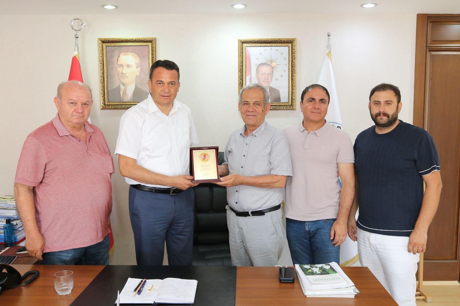 Genel başkan Yılmaz Karaca günün anısına Başkan Ulutaş’a plaket takdim ederken, Başkan Ulutaş da TGF heyetine Kaş’ın doğal ürünlerini hediye etti.
