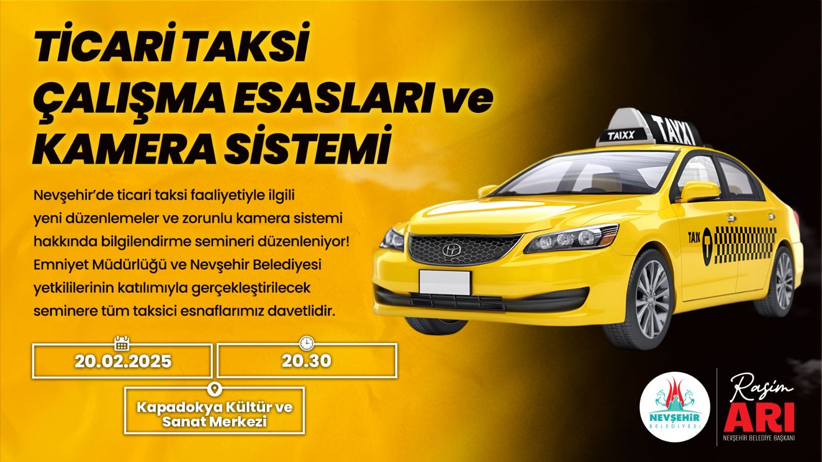 Bahsedilen değişikliklerin anlatılması ve usulsüz taksi kullanımlarının önüne geçilmesi için 20.02.2025 Perşembe günü bugün saat 20.30 da Kapadokya Kültür ve Sanat Merkezi’nde Nevşehir Emniyet Müdürlüğü ve Nevşehir Belediyesi bünyesindeki yetkili personeller tarafından Ticari Taksi Çalışma Esasları ve Kamera Sistemleri konulu seminer düzenlenecek.