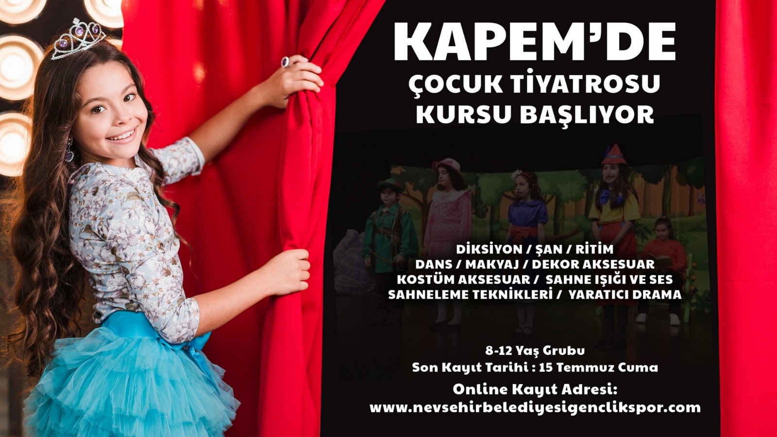 8- 12 yaş aralığındaki çocukların ücretsiz olarak katılabilecekleri kursta, rol, mimik, diksiyon, şan, ritim, dans, kostüm, temel oyunculuk, sahneleme teknikleri ve yaratıcı drama alanlarında eğitimler verilecek.