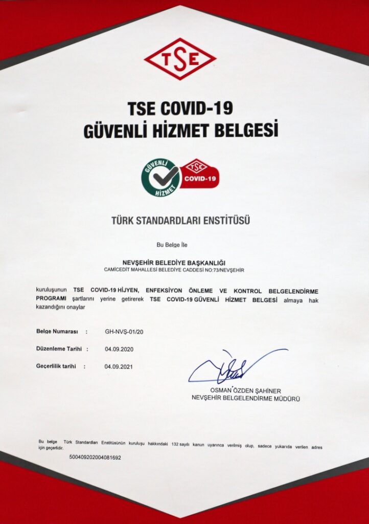 Nevşehir Belediyesi, Türk Standartları Enstitüsü (TSE) tarafından Hijyen, Enfeksiyon Önleme ve Kontrol Belgelendirme Programı şartlarını yerine getirerek “TSE Covid-19 Güvenli Hizmet Belgesi” almaya hak kazandı.