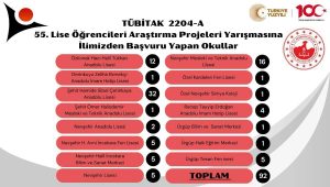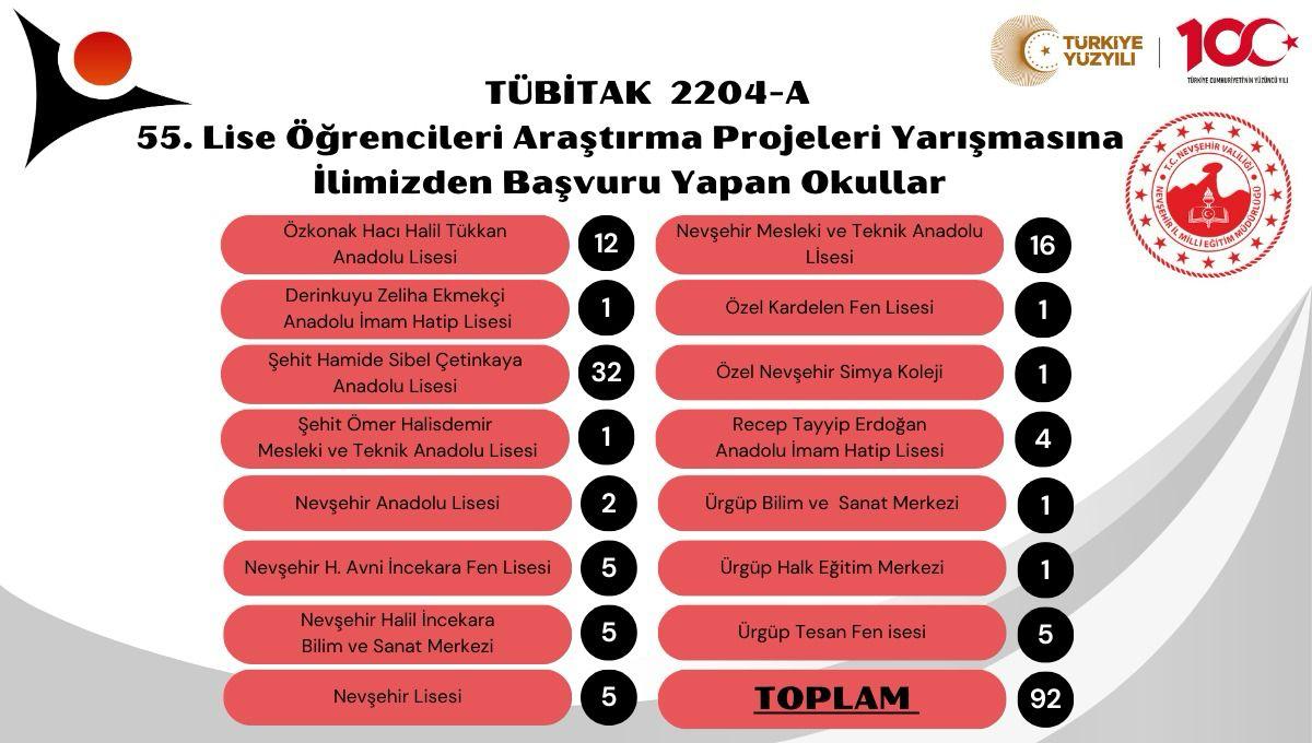 TÜBİTAK Bilim İnsanı Destek Programları Başkanlığı (BIDEB) tarafından lise öğrenimine devam etmekte olan öğrenciler için projeler geliştiriliyor. Temel, sosyal ve uygulamalı bilim alanlarında çalışmalar yapmaya teşvik etmek, çalışmalarını yönlendirmek ve mevcut bilimsel çalışmalarının gelişimine katkı sağlamak amacıyla düzenlenen “2204-A Lise Öğrencileri Araştırma Projeleri Yarışması” düzenleniyor. Bu kapsamda 2024 yılına ait ilimizden 14 okuldan toplam 92 proje başvurusu yapıldı.
