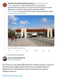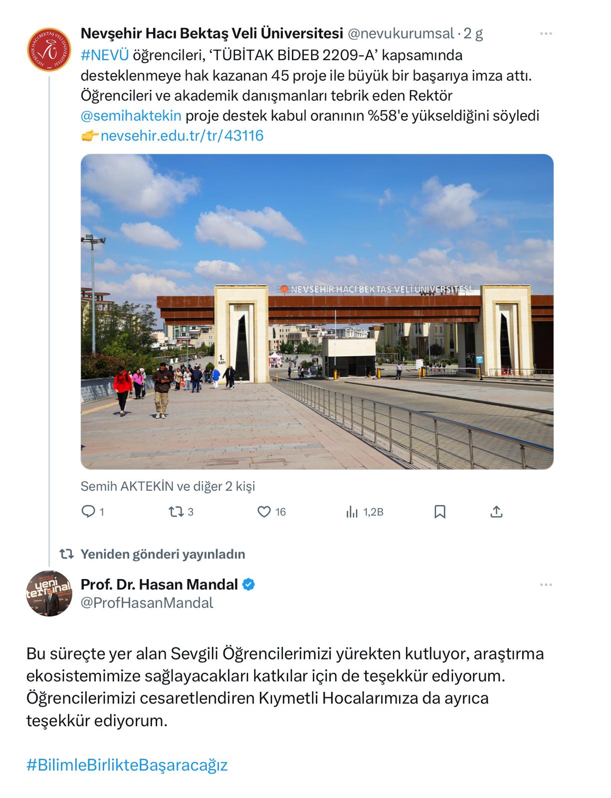 Türkiye Bilimsel ve Teknik Araştırma Kurumu (TÜBİTAK) Başkanı Prof. Dr. Hasan Mandal, ‘TÜBİTAK BİDEB 2209-A’ kapsamında hazırladıkları 45 proje ile desteklenmeye hak kazanan Nevşehir Hacı Bektaş Veli Üniversitesi (NEVÜ) öğrencilerini ve akademik danışmanlık sağlayan araştırmacıları kutlayarak teşekkür etti.