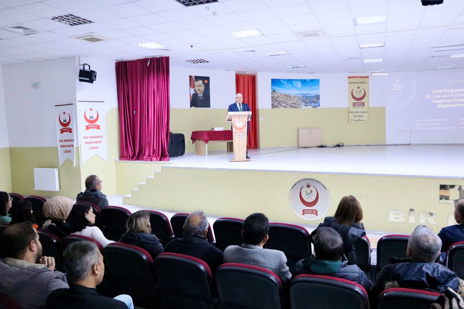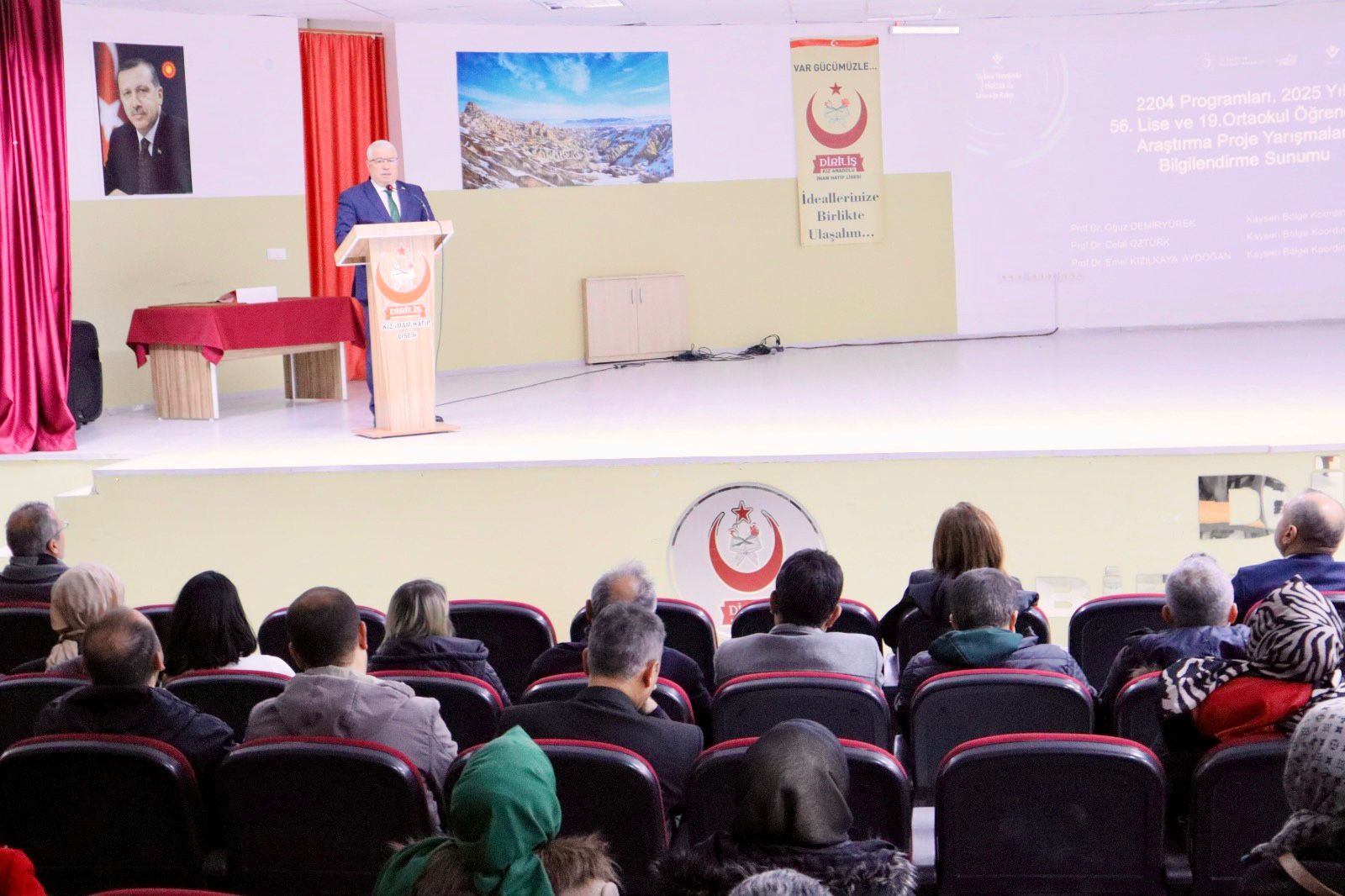 Çalışmalarını yönlendirmek ve mevcut bilimsel çalışmalarının gelişimine katkı sağlamak amacıyla düzenlenen 2204-A Lise Öğrencileri Araştırma Projeleri Yarışması, 2204-B Ortaokul Öğrencileri Araştırma Projeleri Yarışması, 2204-C Lise Öğrencileri Kutup Araştırma Projeleri Yarışması ve 2204-D Lise Öğrencileri İklim Değişikliği Araştırma Projeleri Yarışması hakkında bilgilendirme toplantısı İl Millî Eğitim Müdürü Yusuf Yazıcı, TÜBİTAK Kayseri Bölge Koordinatörü Prof. Dr. Oğuz Demiryürek, Bölge Koordinatör Yardımcısı Prof. Dr. Celal Öztürk ve Prof. Dr. Emel Kızılkaya Aydoğan’ın katılımlarıyla Diriliş Kız Anadolu İmam Hatip Lisesi konferans salonunda yapıldı.