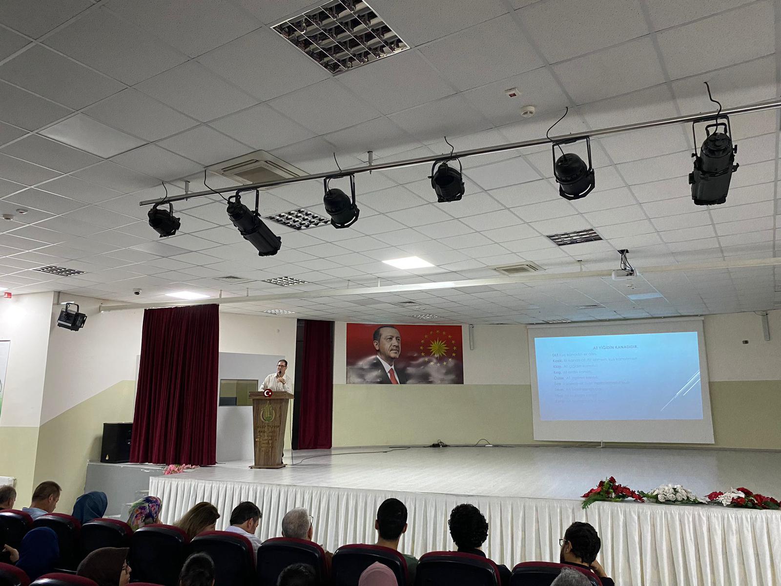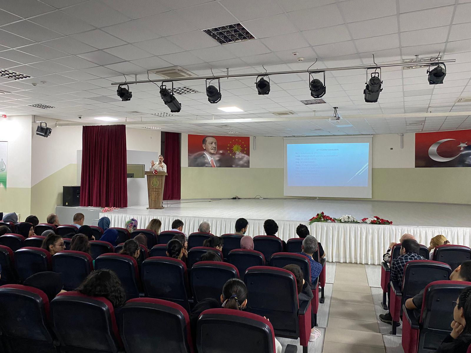 “TÜBİTAK Bilim Söyleşileri” kapsamında Çukurova Üniversitesi Öğretim Görevlisi Prof. Dr. Engin ÇETİN tarafından Recep Tayyip Erdoğan Proje İmam Hatip Lisesinde öğrencilere “En Eski Türk Atasözlerinin İzlerinde” konulu bilim söyleşisi gerçekleştirildi. Program sonunda Prof. Dr. Engin ÇETİN’e, İl MEM müdür yardımcısı Murat SALTIK tarafından hediye takdim edildi.