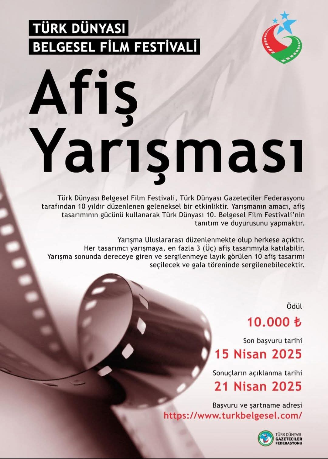 Türk Dünyası Gazeteciler Federasyonu öncülüğünde devlet kuruluşları, meslek örgütleri, üniversitelerin destekleri ve basın kuruluşlarının katkıları ile yapılan Türk Dünyası Belgesel film festivalinin onuncusu için uluslar arası afiş yarışması yapılıyor.