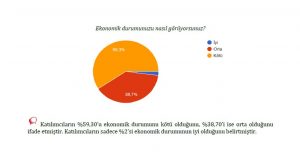 Katılımcıların %59,30’u ekonomik durumunu kötü düzeyde olduğunu, %38,70’i ise orta düzeyde olduğunu ifade etmiştir. Katılımcıların sadece %2’si ekonomik durumunun iyi düzeyde olduğunu belirtmiştir.