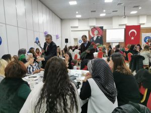 Kadın Hakları konusunda da önder olan Mustafa Kemal Atatürk, aziz şehitlerimiz ve Kahraman kadınlarımız anısına saygı duruşu ve İstiklal Marşı ile geceye başlandı. Kadın Komisyonu Başkanı Afet ÖZÇAM’IN günün anlam ve önemini belirten konuşmasıyla devam edildi. İlerleyen dakikalarda Türk Eğitim Sen Nevşehir Şube Başkanı Tayfur URGENÇ, kadınların gününü kutlayarak bir selamlama konuşmasını gerçekleştirdi. Daha sonra Nevşehir Belediye Başkan adayı Adnan DOĞU, geceye katılarak kadın üyelerin 8 Mart Dünya Kadınlar Gününü karanfil vererek kutladı.