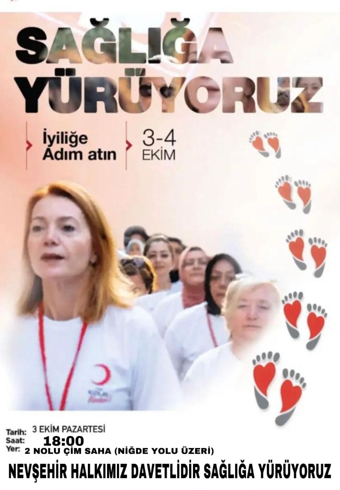 Tüm Dünya ülkelerinde ve ülkemizde, toplumda hareketsiz ve sağlıksız yaşam sorunu hızla artmaya devam ediyor. Pandeminin de etkisiyle obezite ve kronik hastalıklardaki artış hız kazanırken bu artış bize obezite ve kronik hastalıkların gelecek yaşamımızın diğer büyük bir sağlık sorunu olabileceği riskini gösteriyor. Bu amaçla 3-4 Ekim Dünya Yürüyüş Gününde fiziksel aktivite ve sağlıklı beslenmenin önemini vurgulamak, sağlıklı yaşam ve yaşlanmaya dikkat çekmek amacıyla, Türk Kızılay Nevşehir Şubesi, Kızılay Kadın, Genç Kızılay olarak 3 Ekim Pazartesi saat 17.30 da Borsa Kavşağı karşısındaki Kızılay Nevşehir Şubesi binası önünden başlayarak 2 Nolu Çim Sahada yürüyüş gerçekleştirilecek.