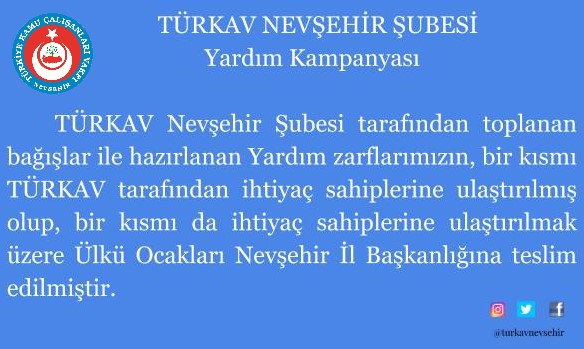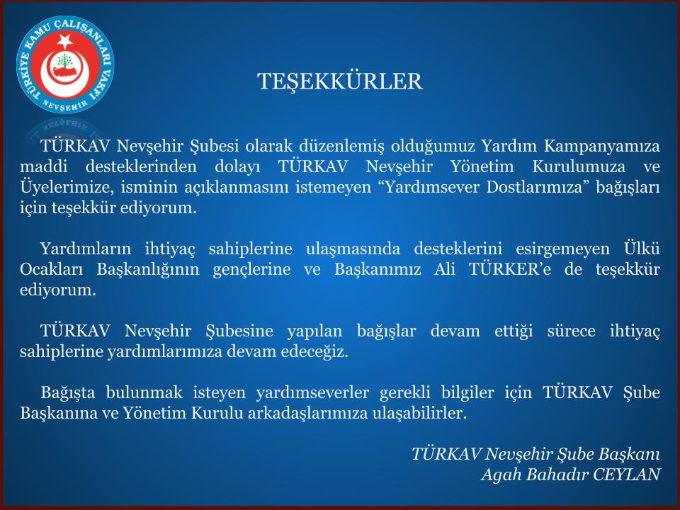 TÜRKAV Nevşehir Şube Başkanı Agah Bahadır Ceylan yaptığı açıklamada “TÜRKAV Nevşehir Şubesi olarak düzenlemiş olduğumuz yardım kampanyamıza maddi desteklerinden dolayı TÜRKAV Nevşehir Yönetim Kurulumuza ve üyelerimize, isminin açıklanmasını istemeyen “Yardımsever Dostlarımıza” bağışları için teşekkür ediyorum.