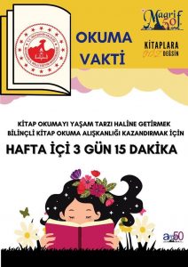 “Okuma Vakti”; pazartesi- çarşamba-cuma günleri ilk dersin ilk 15 dakikası bu faaliyete ayrılarak herkesin okuma faaliyetine katılması sağlanıp dilimizin iyi kullanmasını ve düşünce dünyasının geliştirilmesi hedefleniyor. “Kitabım Senindir”; evlerimizde bulunan hikaye, roman gibi kitapların okullarımıza kazandırılması hedeflenmekte.