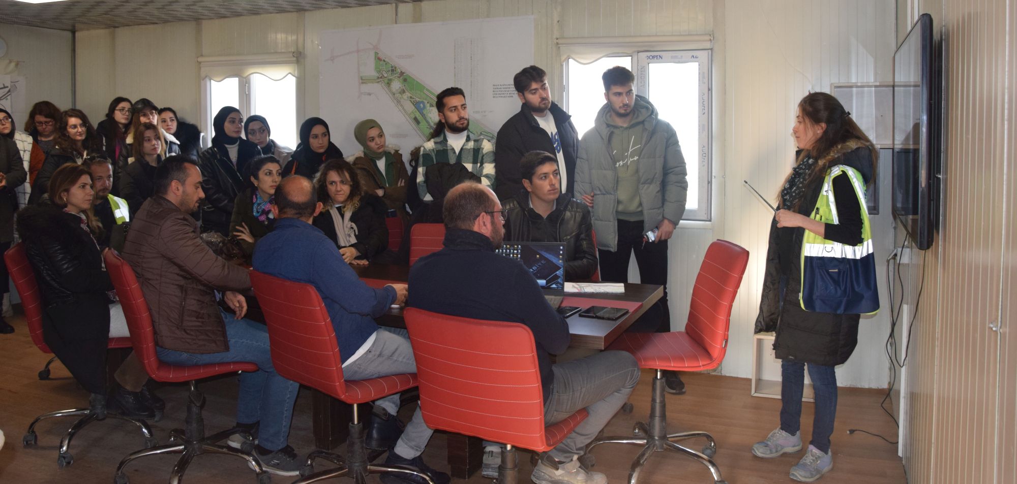 Peyzaj Mimarlığı Bölüm başkanı Doç. Dr. Meliha Aklıbaşında ve bölüm öğretim üyeleri Doç. Dr. Aslıhan Tırnakçı, Doç. Dr. Esra Özhancı ve Dr. Öğr. Üyesi Murat Yücekaya koordinesinde gerçekleştirilen gezide; ilk olarak şantiye binasında şantiye şefleri Mesut Karabıçak ve Ahmet Tekin, saha şefi Volkan Bozdağ ve peyzaj mimarı Fatoş Birkan Kılınç tarafından yapılan sunumda projenin kapsamı, şimdiye kadar sahada gerçekleştirilmiş olan yapısal ve bitkisel uygulamalara yönelik teknik detaylar ve gelinen son durum hakkında detaylı bilgiler verildi. Sunum sonrasında yapılan uygulamaları yerinde incelemek amacıyla saha gezisi gerçekleştirildi. 1.260.000,00 metrekare arazi üzerine inşaa edilen millet bahçesinde yer alan yeşil alanlar, biyolojik gölet, sert zemin uygulamaları, sulama sistemleri, yeşil alan uygulamaları (bitki dikimi, hydroseeding uygulaması, tercih edilen bitki türleri vb.) yerinde incelendi ve uygulamalar hakkında teknik bilgiler edinildi.