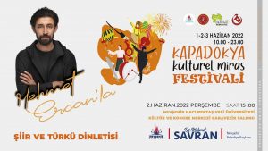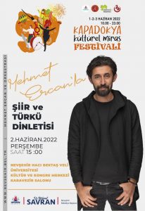 Nevşehir Hacı Bektaş Veli Üniversitesi (NEVÜ)’de gerçekleştirilecek olan ‘1. Kapadokya Kültürel Miras Festivali’ kapsamında Mehmet Ercan ve Orkestrası 2 Haziran Perşembe günü şiir ve türkü dinletisi sunacak.