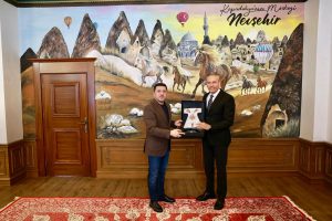 Nevşehir Belediyesi başkanlık makamında gerçekleşen ziyarette, Belediye Başkan Yardımcıları İbrahim Yüzer ve Ahmet Çöler de hazır bulundu. Görüşmede, Nevşehir’in turizm potansiyelinin daha etkin değerlendirilmesine yönelik önemli başlıklar ele alındı. Ziyarette, Nevşehir Belediyesi’nin hâlihazırda sürdürdüğü turizm yatırımları ile 2026 yılında hayata geçirilmesi planlanan projeleri de detaylı şekilde değerlendirildi. Özellikle Kapadokya bölgesinin ulusal ve uluslararası alanda daha güçlü tanıtılması ve bölgeye gelen turist sayısının artırılmasına yönelik yapılabilecek çalışmalar üzerinde duruldu. Görüşmede ayrıca Nevşehir Belediyesi Turizm ve Spor A.Ş.’nin yürüttüğü faaliyetler de ele alınarak, kurumun turizme katkı sağlayacak projeleri hakkında karşılıklı fikir alışverişinde bulunuldu. Turizm altyapısının güçlendirilmesi, yeni destinasyon alanlarının kazandırılması ve sürdürülebilir turizm anlayışının yaygınlaştırılması konuları da gündeme geldi. TÜRSAB heyeti, Nevşehir’in sahip olduğu tarihi, kültürel ve doğal zenginliklerin daha geniş kitlelere tanıtılması noktasında her türlü iş birliğine açık olduklarını ifade ederken, Belediye Başkanı Rasim Arı da belediye olarak turizmi öncelikli alanlardan biri olarak gördüklerini vurguladı. Ziyaret, karşılıklı iyi niyet temennileri ve önümüzdeki süreçte gerçekleştirilebilecek ortak projelere ilişkin değerlendirmelerin ardından sona erdi.