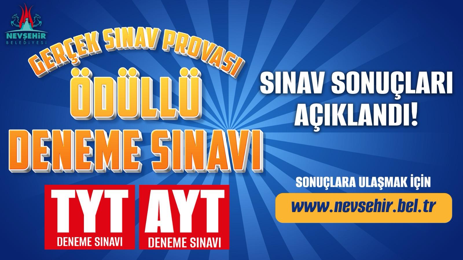Nevşehir Belediyesi tarafından düzenlenen TYT ve AYT Deneme Sınav Sonuçları belli oldu. Öğrenciler sınav sonuçlarını, kendilerine gönderilen kod ile birlikte ww.nevsehir.bel.tr adresinden sorgulayabilecek.