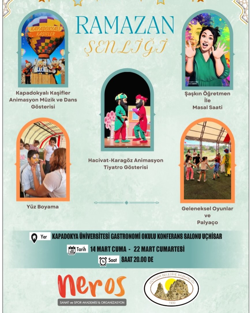 Ramazan Şenliği’nde şaşkın öğretmen ile masal saati, geleneksel oyunlar, palyaço, Kapadokyalı Kaşifler animasyon müzik ve dans gösterisi, Hacivat-Karagöz animasyon tiyatro gösterisi ve yüz boyama etkinlikleri ile akşamlar renklenecek.