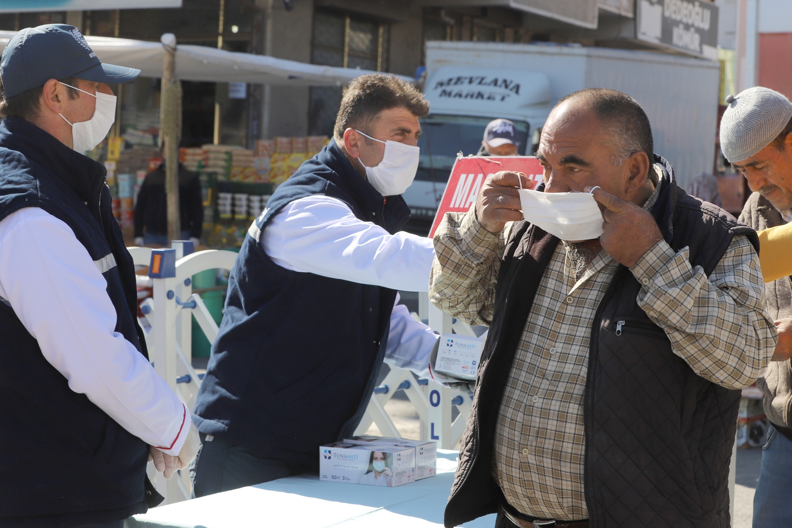 Şehir merkezinde pazar alışverişi için sokağa çıkmak zorunda kalan vatandaşlar, kamu görevlileri, faaliyetlerini sürdüren esnaflara ücretsiz kolonya maske ve eldiven dağıtıldı.
