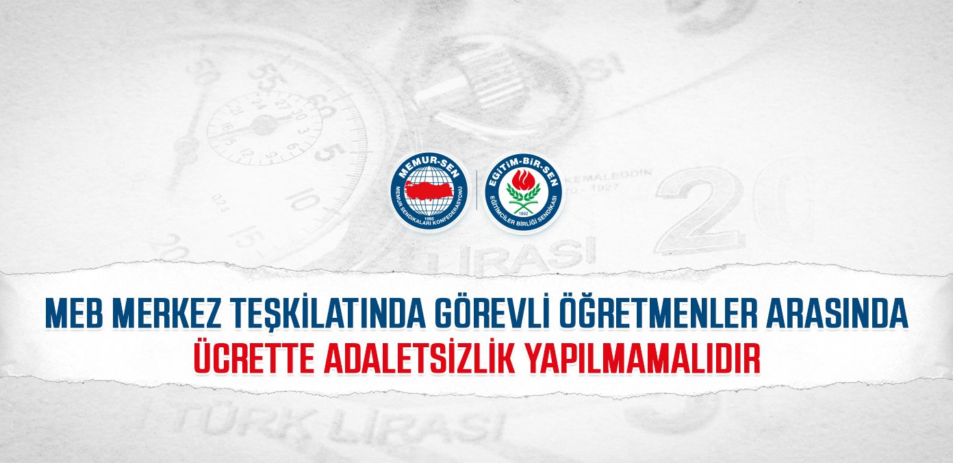 Eğitim-Bir-Sen Nevşehir Şube Başkanlığından yapılan açıklamada, MEB merkez teşkilatında görevli öğretmenler arasında ücrette adaletsizlik yapılmaması gerektiğine dikkat çekildi.