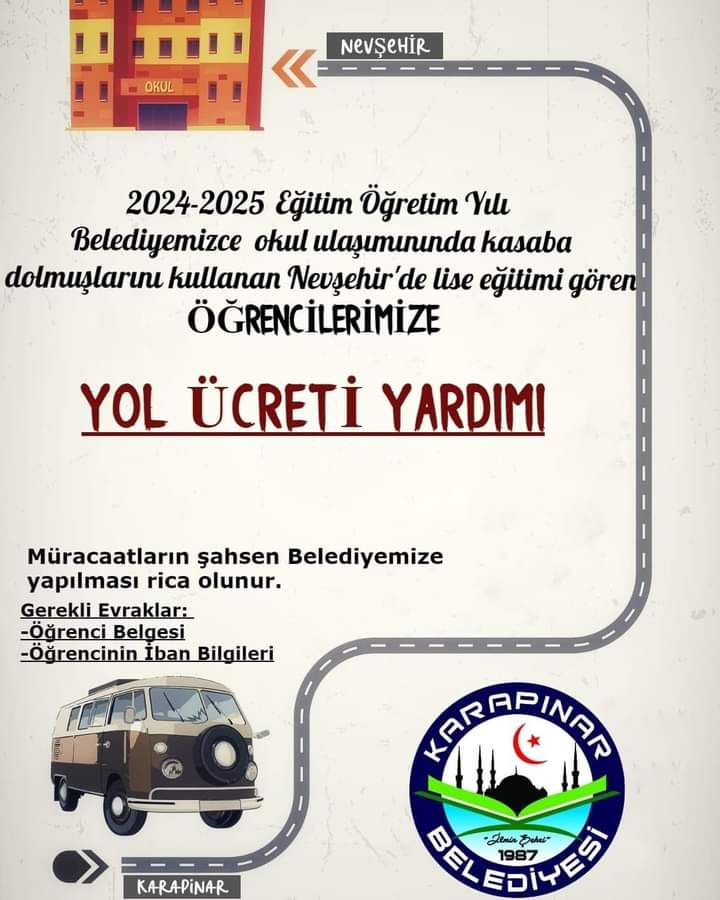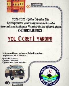 Bu kapsamda kasabamızdan Nevşehir Merkeze Liseye giden ve sabah gidip akşam gelen öğrencilerimize ulaşım ücretlerinin yarısını belediyemizce karşılayacağız.