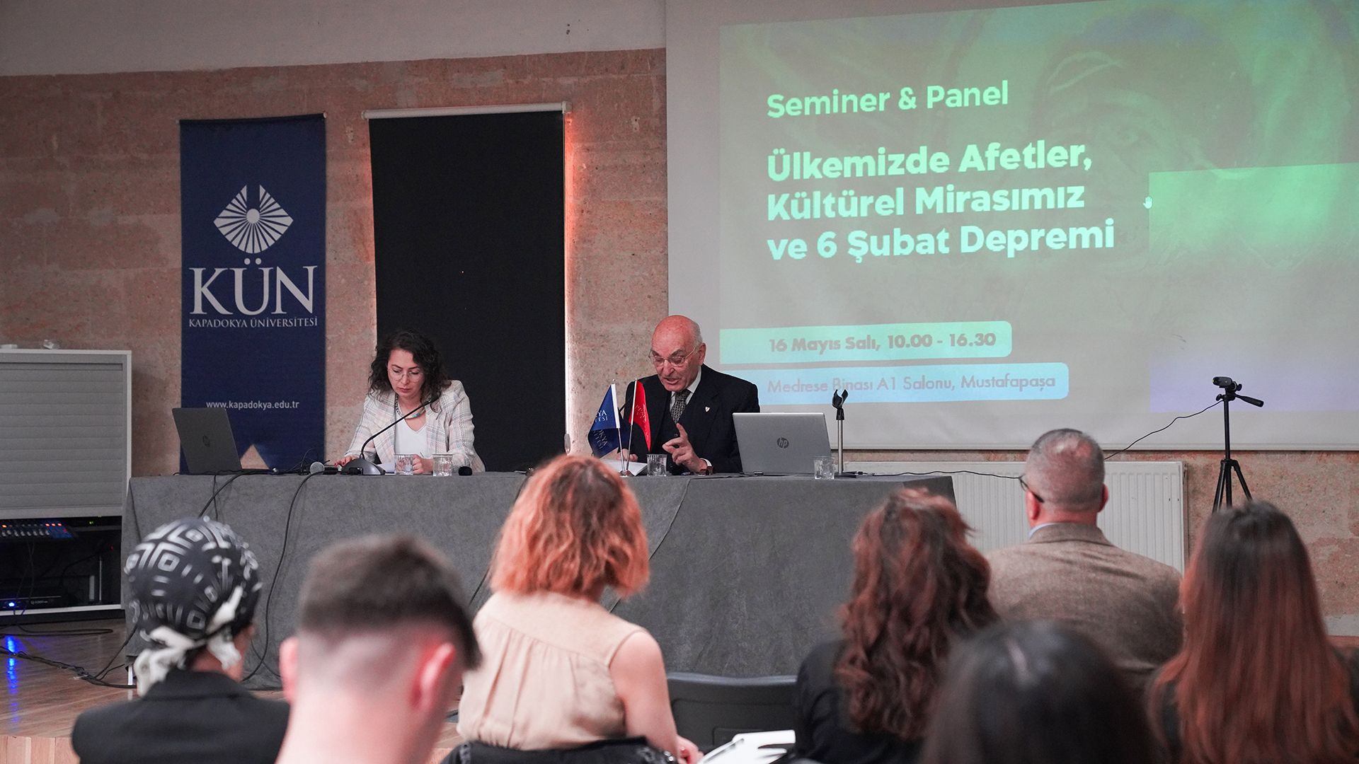 Kapadokya Üniversitesi bünyesindeki Kapadokya Araştırma Merkezi ile Şehir ve Bölge Planlama bölümü iş birliğinde, 16 Mayıs’ta “Ülkemizde Afetler, Kültürel Mirasımız ve 6 Şubat Depremi” konulu seminer ve panel etkinliği yapıldı. İki bölümden oluşan ve hibrit şekilde yapılan programın ilk bölümünde “Afetler ve Kültürel Miras” konulu seminerlere, ikinci bölümündeyse “6 Şubat Depremi Etkisinde Kültürel Mirasımızın Geleceği” başlıklı bir panele yer verildi.