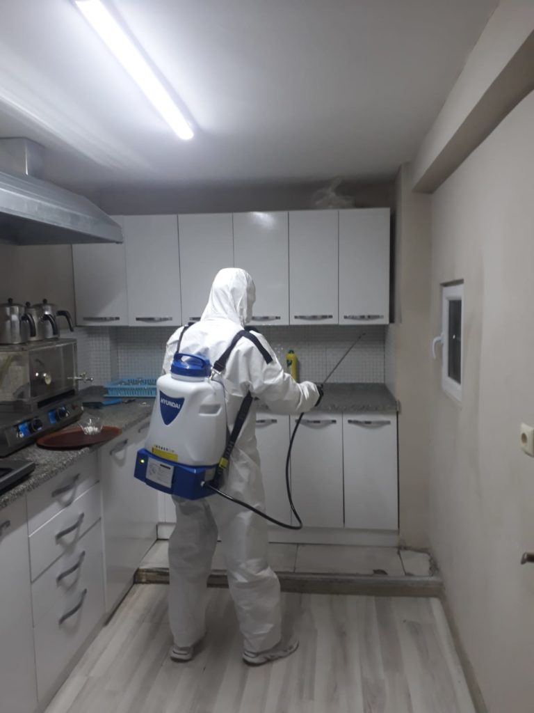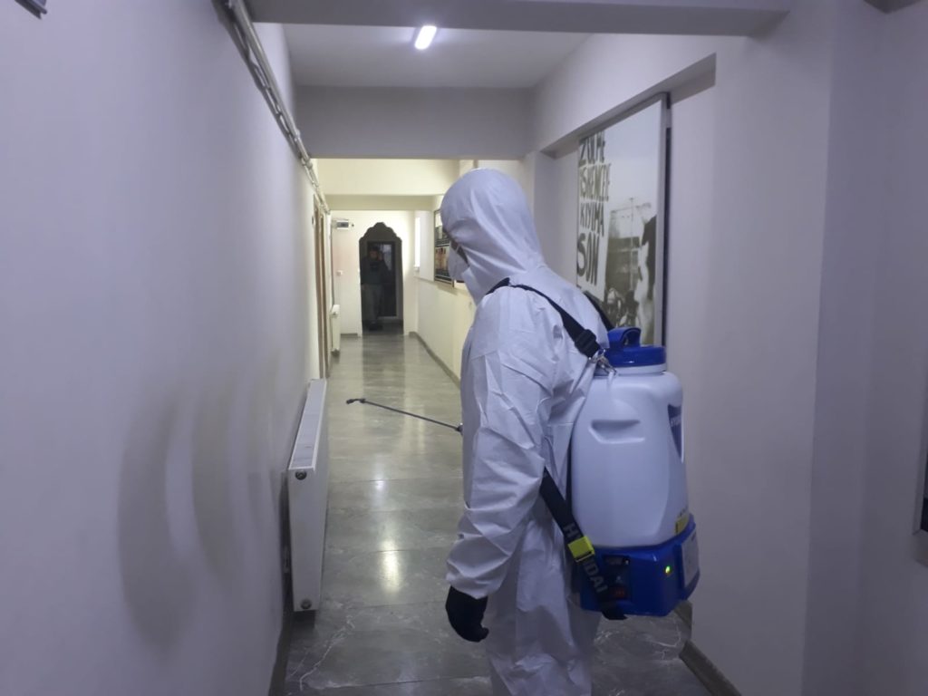 Görevliler hizmet binasında yaklaşık 1 saatlik çalışma yaparak odalara ve seminer salonlarına dezenfekte ilacı sıktı.