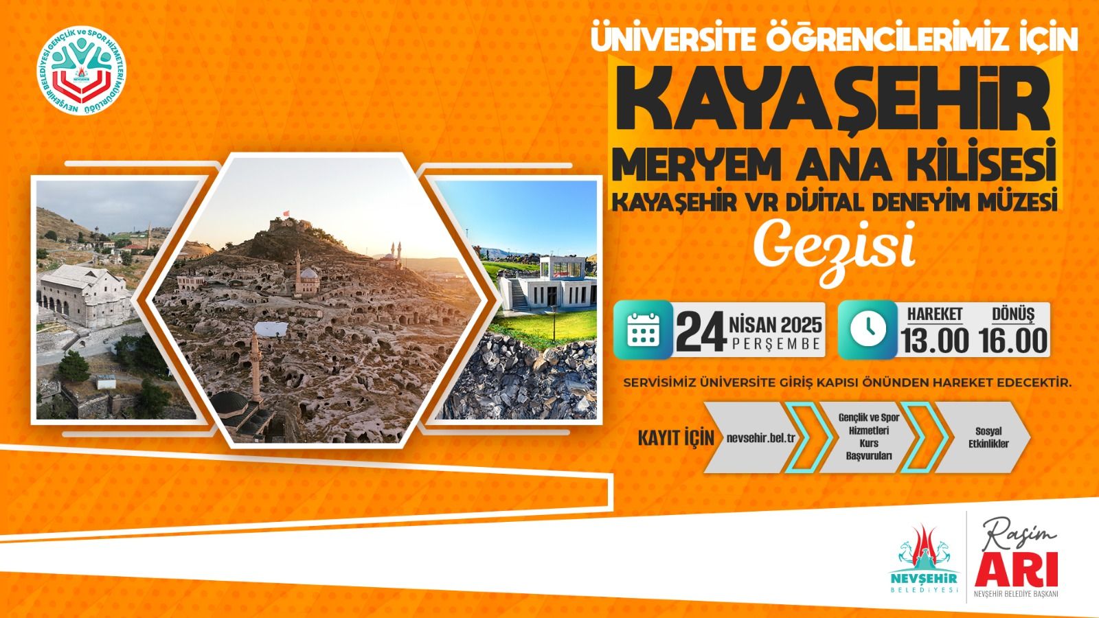 Nevşehir Hacı Bektaş Veli Üniversitesi Yaşam Merkezi içerisinde yer alan ve öğrencilere hizmet veren Gençlik Ofisi yetkililerince düzenlenecek program üniversite öğrencilerine Kayaşehir, Meryem Ana Kilisesi, Kayaşehir VR dijital deneyim müze gezisini görme ve deneyimleme fırsatı verecek. Öğrenciler Nevşehir Belediyesi web sayfası üzerinden Gençlik ve Spor Hizmetleri kurs başvuruları sosyal etkinlikler linkinden online kayıt yaptırarak bu eşsiz gezinin tadını çıkarabilecekler.