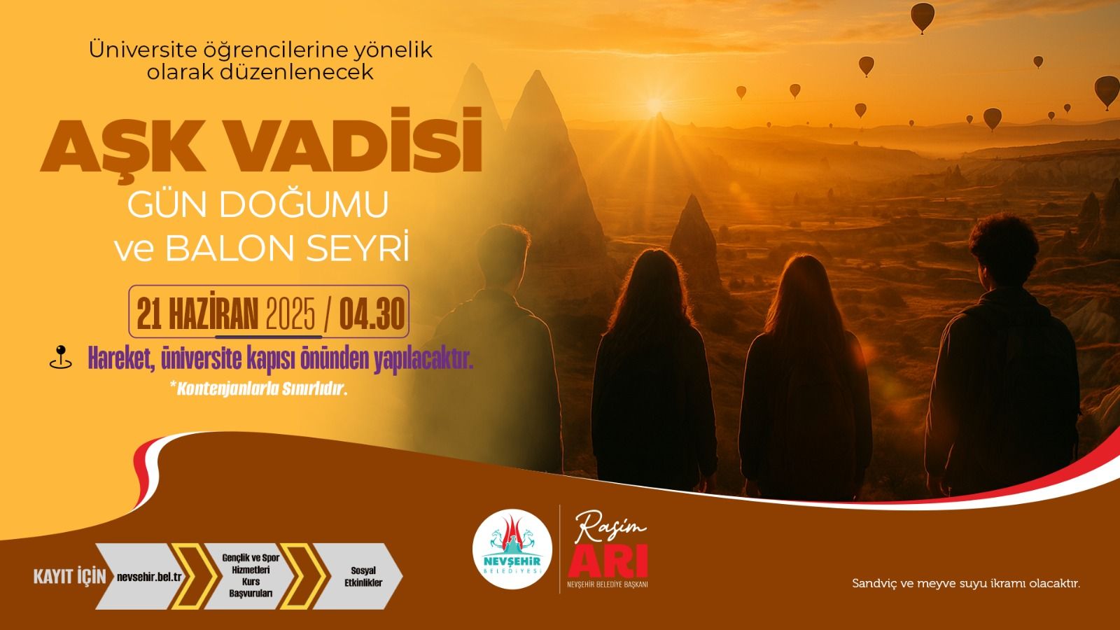 Nevşehir’in İl oluşunun 70. Yılı kapsamında yapılacak olan etkinlik günün ilk ışıklarıyla harika manzarası olan Göreme Aşk Vadisi’nde gün doğumunu ve sıcak hava balonlarının kalkışını seyretmek isteyen üniversite öğrencileri için bir fırsat olarak bildirildi.