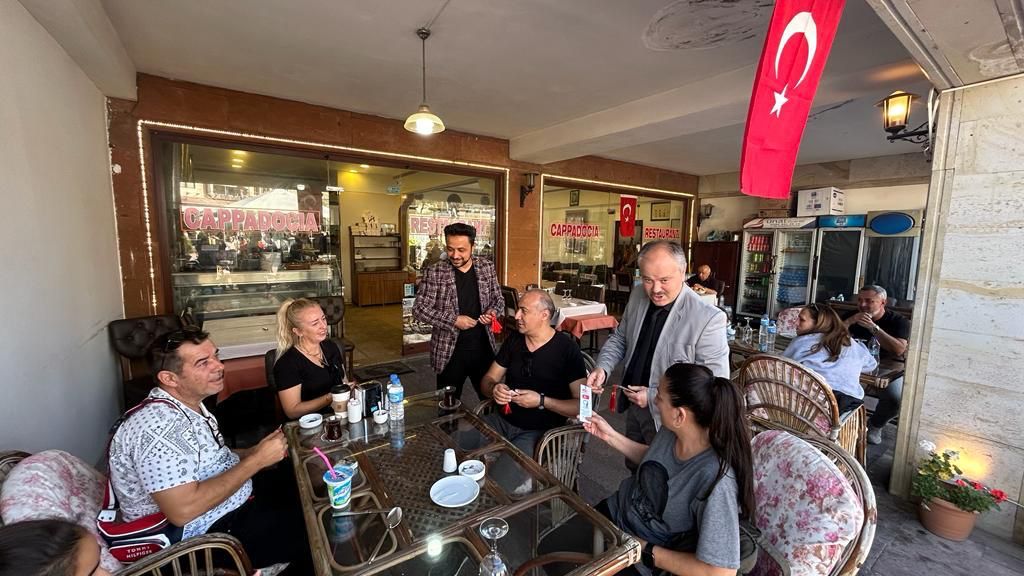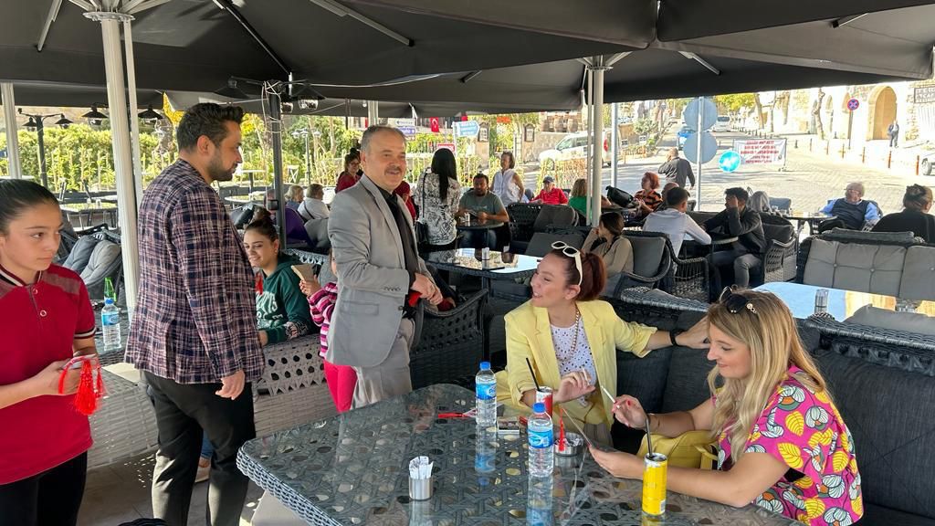 İlçe meydanındaki kafeler, lokantalar ve diğer iş yerleri ziyaretinde İlçe Milli Eğitim Müdürü Savaş Özdemir, Şube Müdürü Adem Çete, Okul Müdürü Nuri Çatin, Müdür Yardımcısı Büşra Doğruer, Zahide Karaca, Sare Akırmak ve Hatice Zengin isimli öğretmenler yer aldılar.