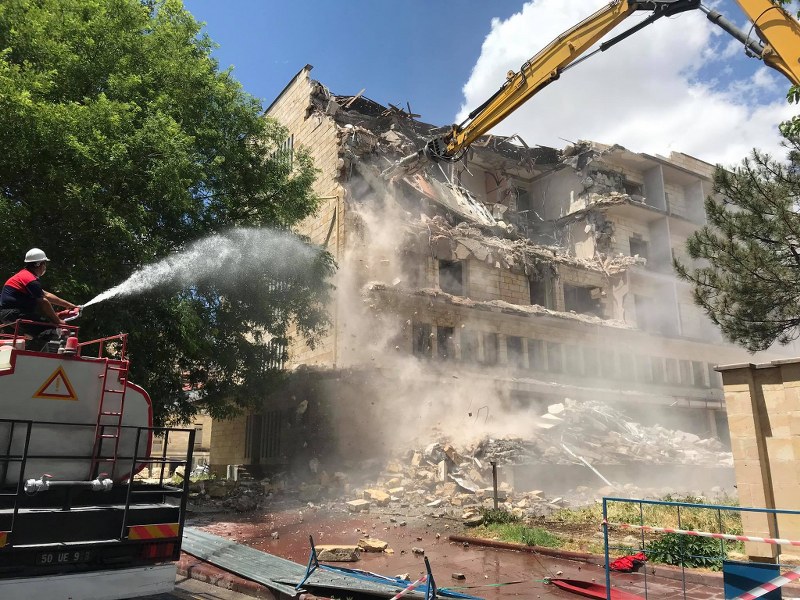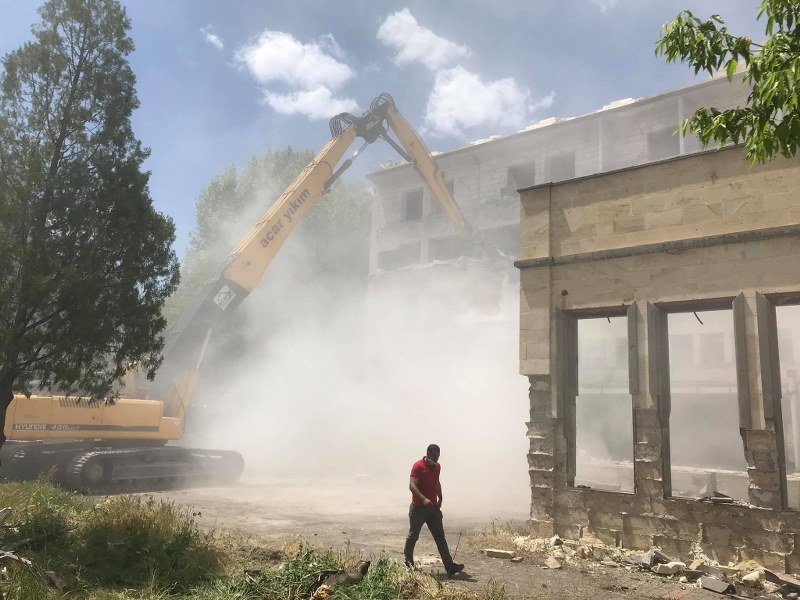 Yıkım çalışmaları sırasında çevreye toz ile rahatsızlık verilmemesi için tazyikli su sıkılarak da önlem alınıyor.