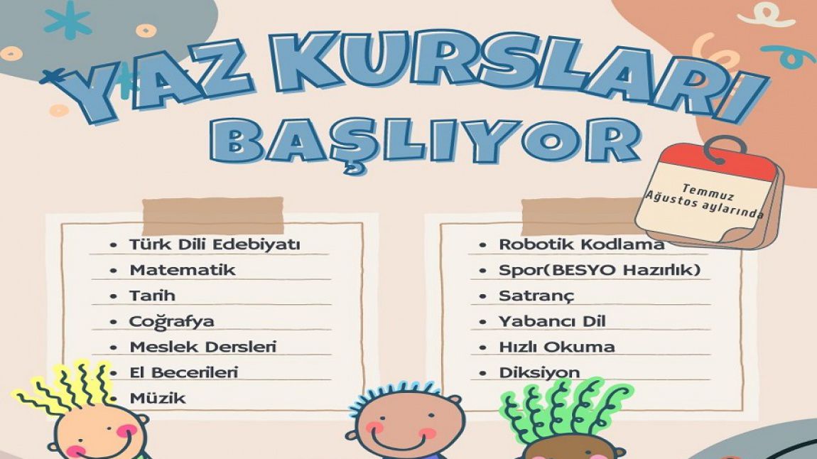 Öğrencilerin yaz tatilinde daha verimli ve etkin zaman geçirebilmeleri amacıyla yaz etkinlikleri kursları düzenlenecek.