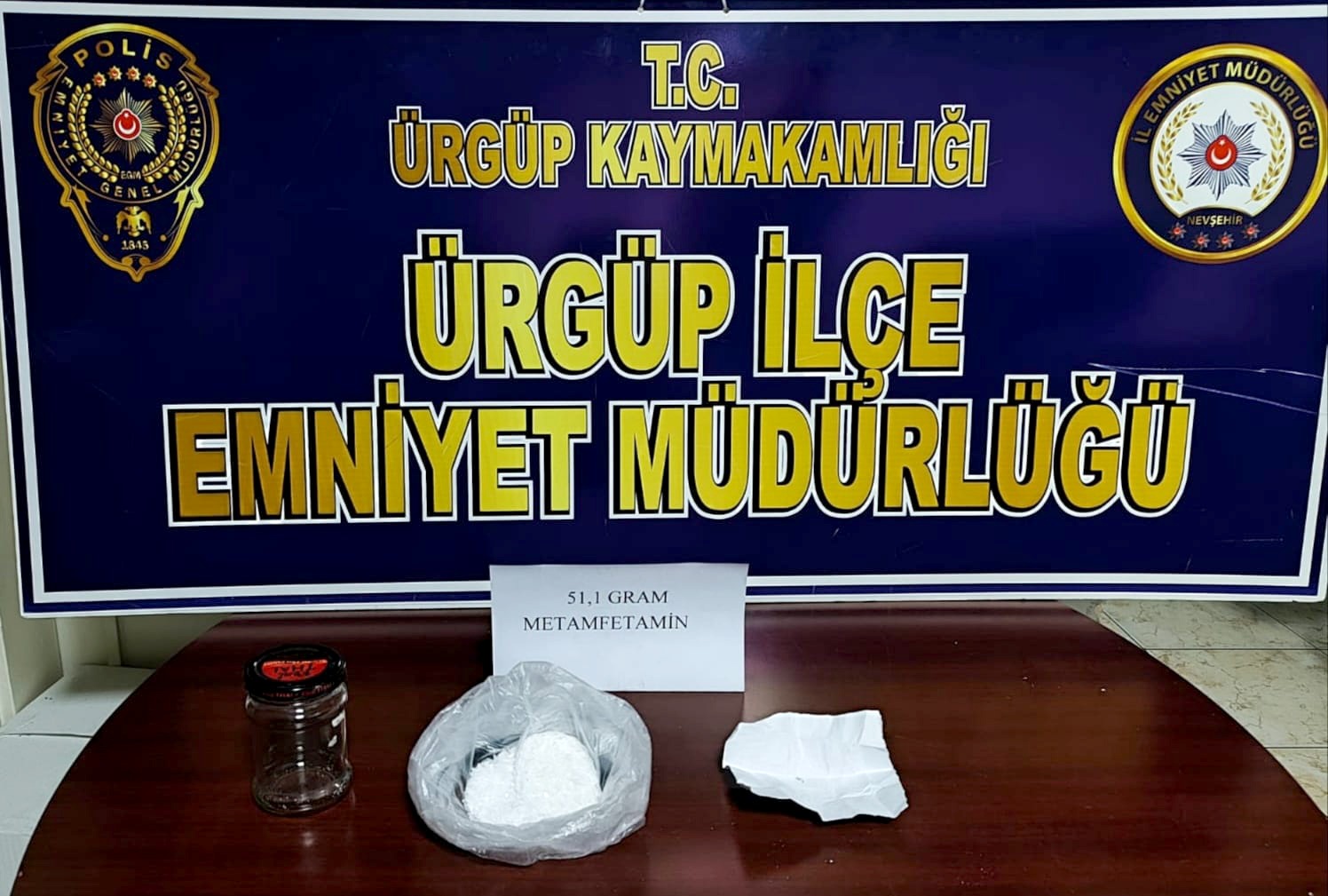 Ürgüp İlçe Emniyet Müdürlüğü ekiplerince yapılan çalışmada 1 kişi tutuklandı. Emniyet ekiplerince şüphe üzerine durdurulan bir araçta, toplamda 51,1 gr. metamfetamin ele geçirilirken şüpheli 1 şahıs tutuklanarak cezaevine teslim edildi.