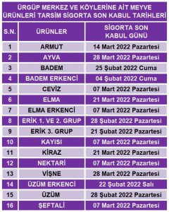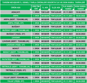 Bir yıllık emeğin heba olmaması için, çiftçilerimizi tarım sigortası yapmaya ve Ürgüp’te yetkili olarak Tarım Kredi Kooperatifine veya yetkili sigorta acentelerinden herhangi birine başvuruda bulunarak Tarımsal ürünlerini, Hayvan varlıklarını ve Tarımsal işletmelerini TARSİM sigortası yaptırmaları konusun da çiftçilerimizi önemle uyarıyoruz. Nevşehir il geneli tarla ürünleri ve Ürgüp İlçe geneli meyve sigorta son kabul tarihlerini paylaşıyoruz.” dedi.