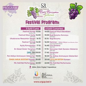 6 Eylül Cumartesi günü ise festival köyü etkinlikleriyle devam edecek programda, bağ bozumu konvoyu ve üzüm hasadı gerçekleştirilecek. Gün boyu düzenlenecek halk dansları gösterileri, seminerler ve animasyonlarla renklenen festival, akşam Ceylan Ertem konseri ve Mc Halil Bal performansıyla sona erecek.