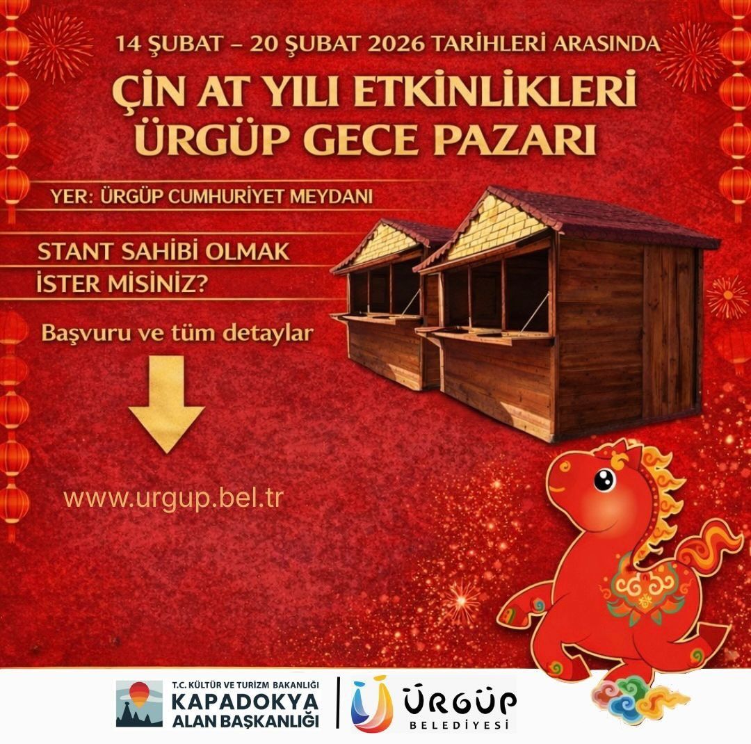 Kapadokya Alan Başkanlığı ile Ürgüp Belediyesi iş birliğinde düzenlenecek Çin At Yılı Etkinlikleri – Gece Pazarı, 14–20 Şubat tarihleri arasında Ürgüp Cumhuriyet Meydanı’nda gerçekleştirilecek.