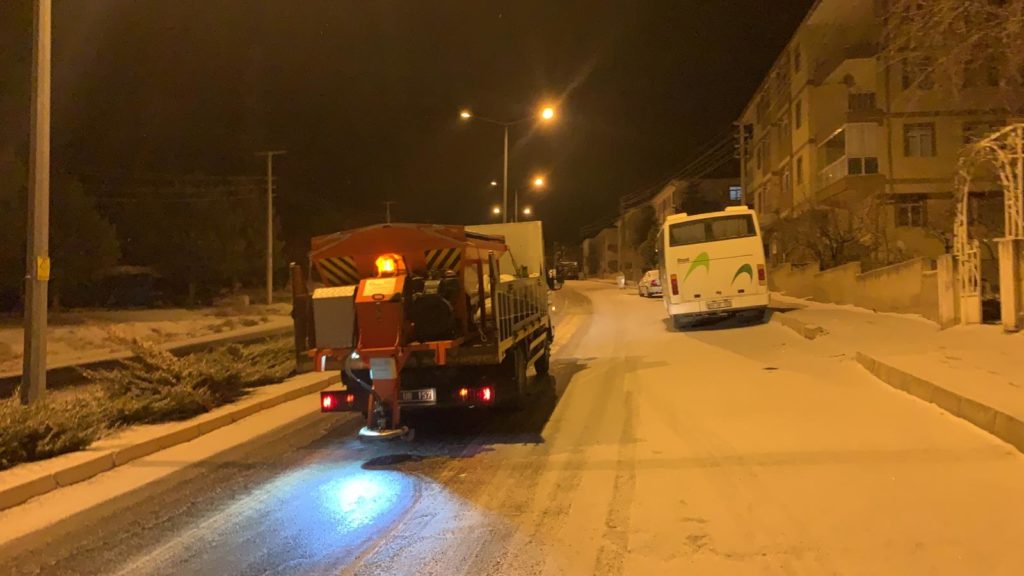 hastane yol güzergâhlarını, ilçe mahallelerinin şehir içi dolmuş güzergâhlarını sabah saatlerine kadar kardan temizleme ve buzlanmaya karşı tuzlama çalışmalarıyla sürdürdü.